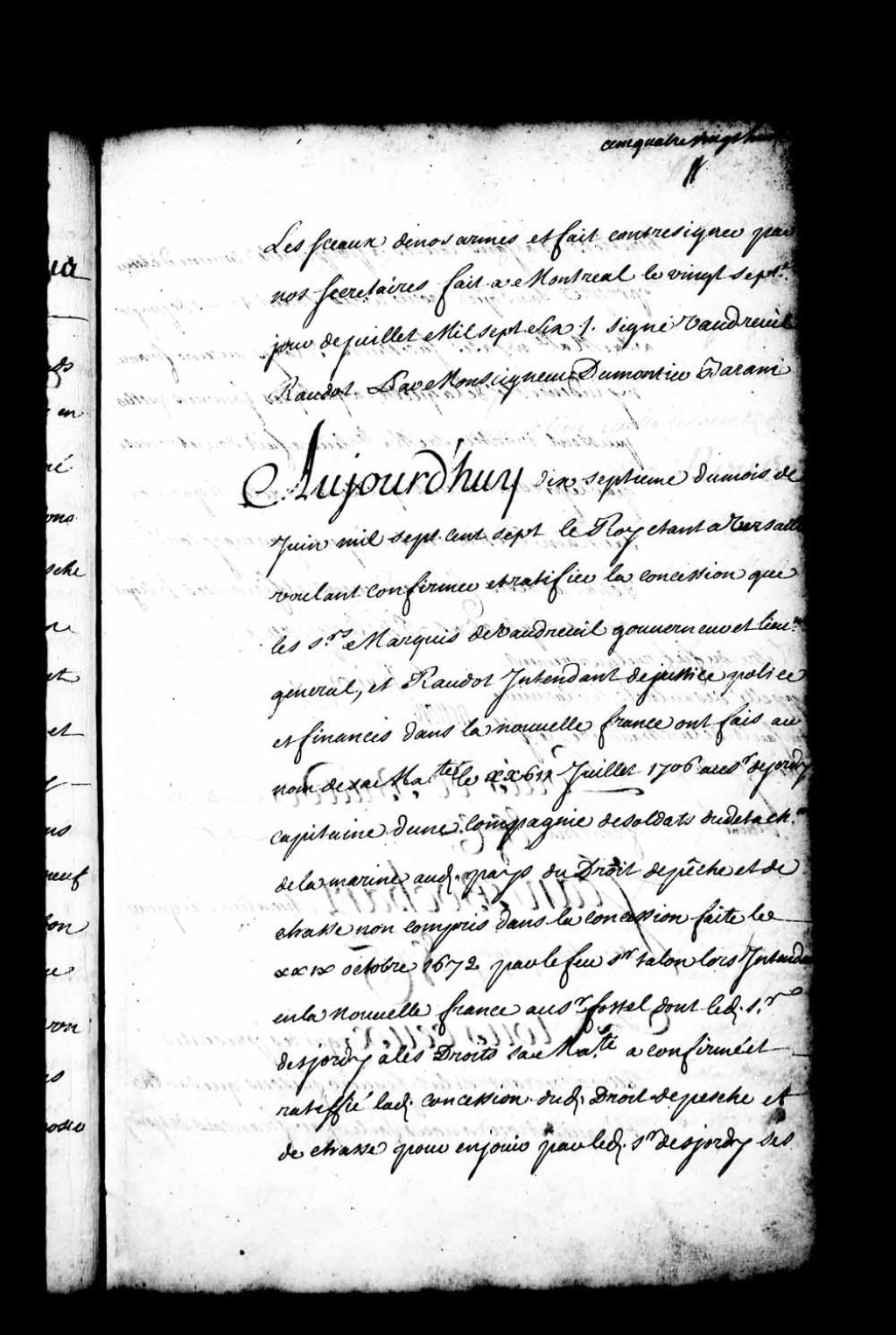 Brevet de confirmation par Sa Majesté de la concession au sieur Desjordy du droit de pêche et de chasse dans l'étendue des îles Bouchard, laquelle concession ayant été faite le 27 juillet 1706 par monsieur de Vaudreuil et monsieur Raudot, gouverneur et intendant en Nouvelle-France, 7 juin 1706, Archives nationales à Québec, Fonds Intendants, (03Q,E1,S4,SS1,D63,P5).