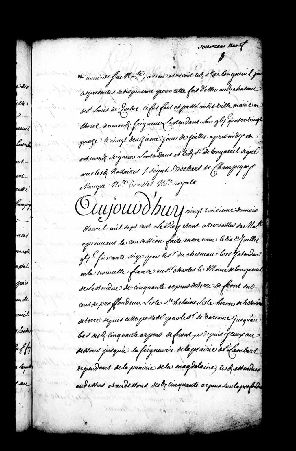 Brevet de confirmation par Sa Majesté de la réunion des concessions faites au sieur Charles Lemoyne (Lemoine) de Longueuil, laquelle réunion ayant été faite le 10 juillet 1676 par messire Duchesneau, intendant de la Nouvelle-France, 23 avril 1700, Archives nationales à Québec, Fonds Intendants, (03Q,E1,S4,SS1,D67,P3).