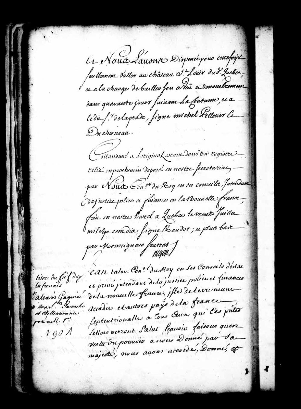 Acte de concession par Jean Talon, intendant de la Nouvelle-France, aux sieurs Gamache et Belleavance d'une demi-lieue de terre sur une lieue de profondeur, en fief et seigneurie, à prendre sur le fleuve Saint-Laurent depuis la concession faite à la damoiselle Amyot (Amiot) vers celle du sieur Fournier, 03 novembre 1672, Archives nationales à Québec, Fonds Intendants, (03Q,E1,S4,SS1,D6,P1).