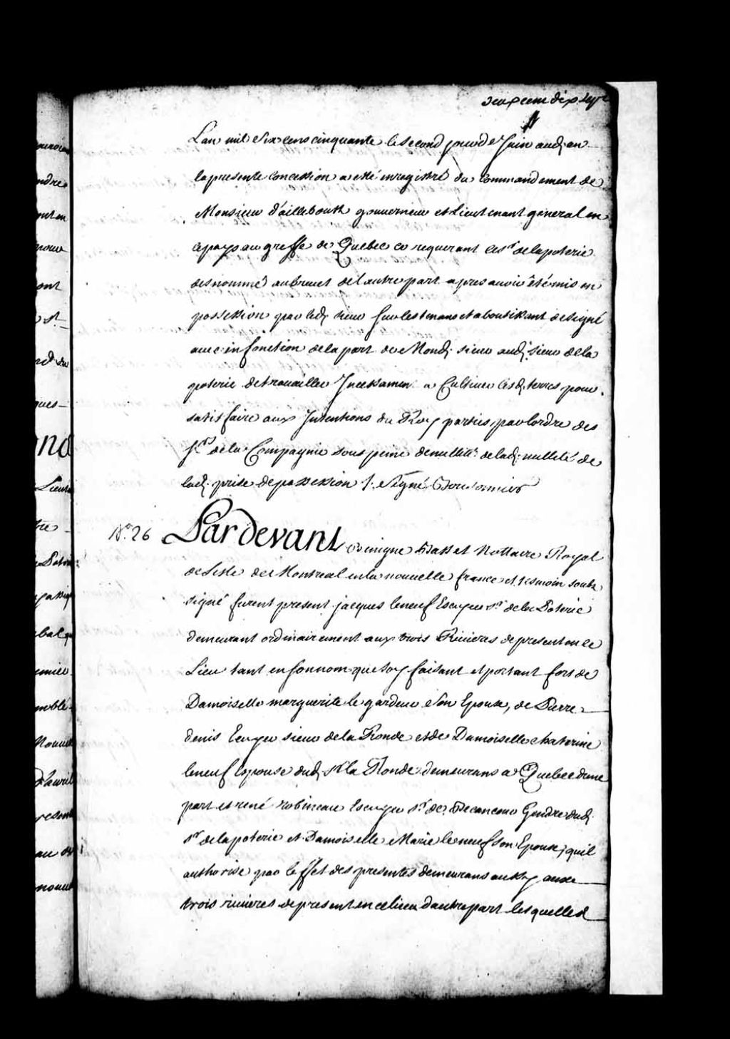 Cession par Jacques Leneuf, écuyer, sieur de la Poterie, des Trois-Rivières, tant en son nom que se portant fort de damoiselle Marguerite Le Gardeur (LeGardeur), son épouse, et de Pierre Denis, écuyer, sieur de la Gronde, et damoiselle Catherine Leneuf, son épouse, à René Robineau, écuyer, sieur de Bécancour, son gendre, et damoiselle Marie Leneuf, son épouse, des Trois-Rivières, du fief de Portneuf à lui concédé le 16 avril 1647 par la Compagnie de la Nouvelle-France (Notaire Bénigne Basset dit Deslauriers)