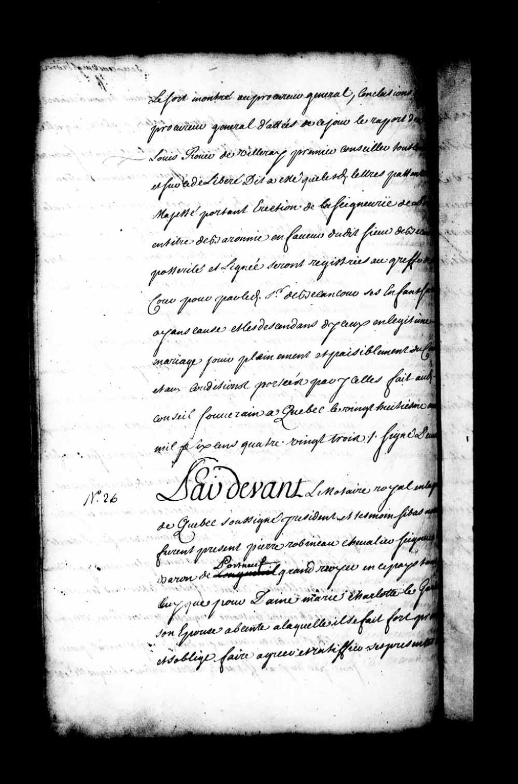 - Acte de transaction et de partage entre Pierre Robineau, Baron de Portneuf, grand voyer en Nouvelle-France, messire Philippe Boucher, curé de Saint-Joseph-de-la-Pointe-Lévy, fondé de pouvoir de René Robineau de Portneuf, Maître Martin de Lino, fondé de procuration de François Desjordy et de Louise-Catherine Robineau, son épouse, et Jacques Robineau, tous héritiers de René Robineau de Bécancour, Baron de Portneuf, par lequel acte la terre et seigneurie de Portneuf demeurera au sieur Robineau (Notaire Florent de La Cetière)