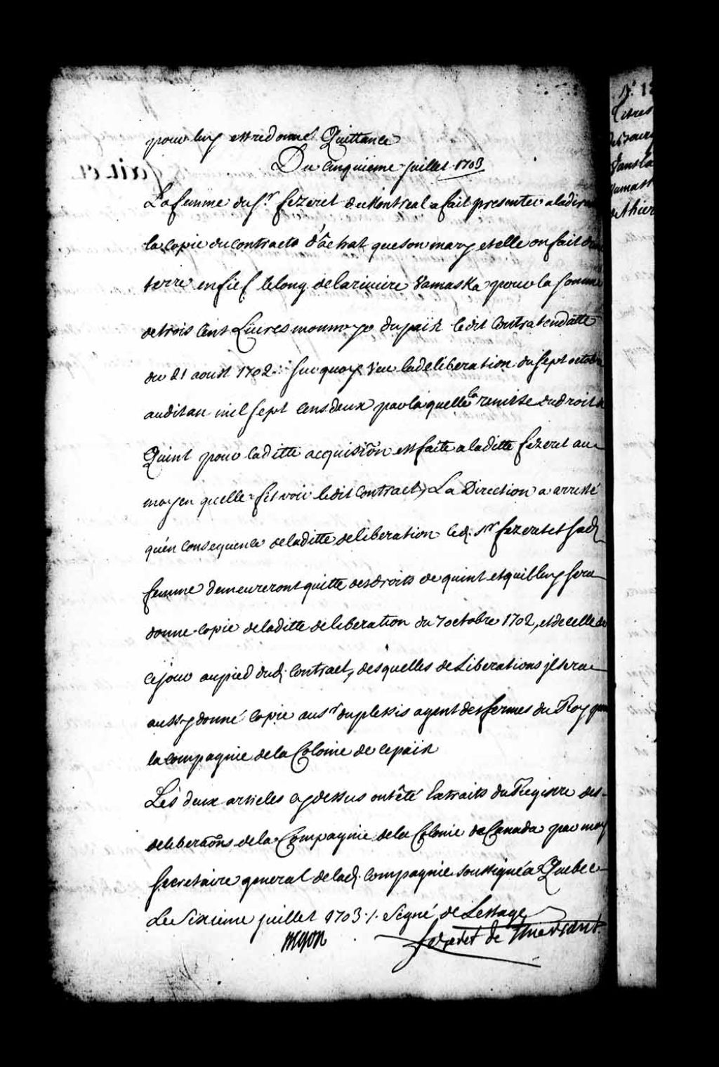 Arrêt de la direction de la Compagnie de la Colonie libérant la femme du sieur Fezeret quant au paiement des droits de quint dus pour l'achat d'un fief sur la rivière Yamaska intervenu le 21 août 1702, 5 juillet 1703, Archives nationales à Québec, Fonds Intendants, (03Q,E1,S4,SS1,D72,P4).