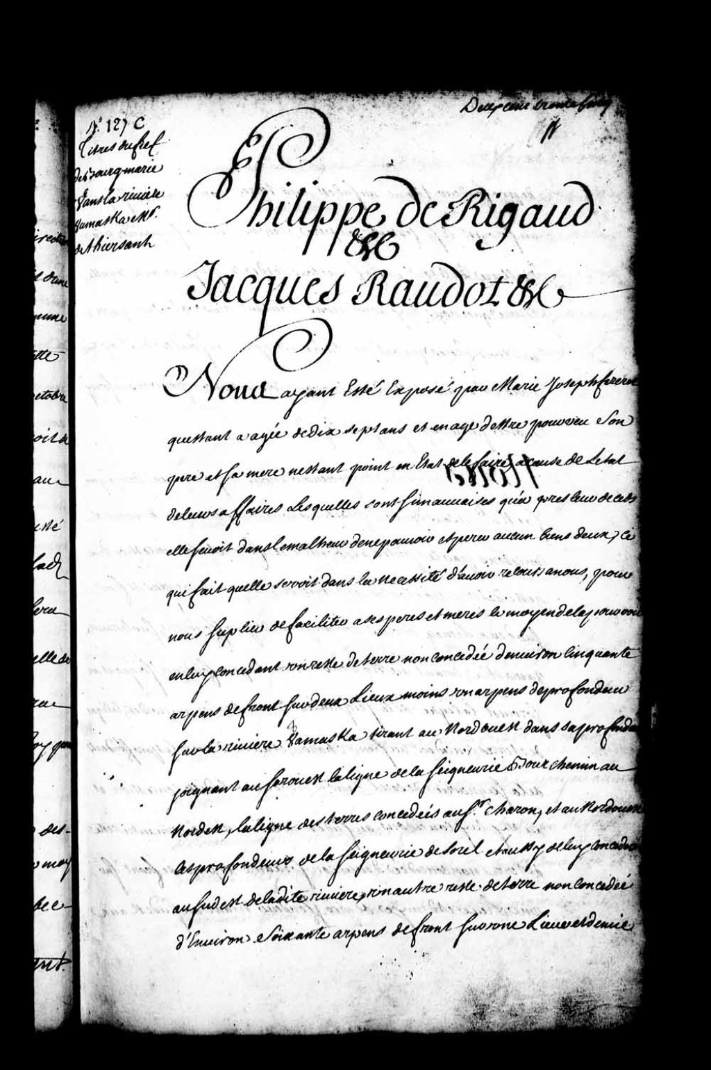 Acte de concession par Philippe de Rigaud, Marquis de Vaudreuil, gouverneur, et Jacques Raudot, intendant de la Nouvelle-France, à damoiselle Marie-Josèphe Fezeret, d'un reste de terres non concédées d'environ cinquante arpents de front sur deux lieues moins un arpent de profondeur, donnant sur la rivière Yamaska, tirant au nord-ouest dans la profondeur, joignant au sud-ouest la ligne de la seigneurie Bourgchemin, au nord-est la ligne des terres concédées au sieur Charon (Charron), et au nord-ouest les profondeur de la seigneurie de Sorel dans l'étendue de ladite concession, et aussi, au sud-est de ladite rivière, un autre reste de terres non concédées d'environ soixante arpents de front sur une lieue et demie de profondeur, tirant au sud-est aux terres non concédées, joignant au sud-ouest les terres du sieur Fezeret, son père, et au nord-est la seigneurie de la Vallière (LaVallière), laquelle concession portera le nom de Bourg-Marie, en titre de fief et seigneurie