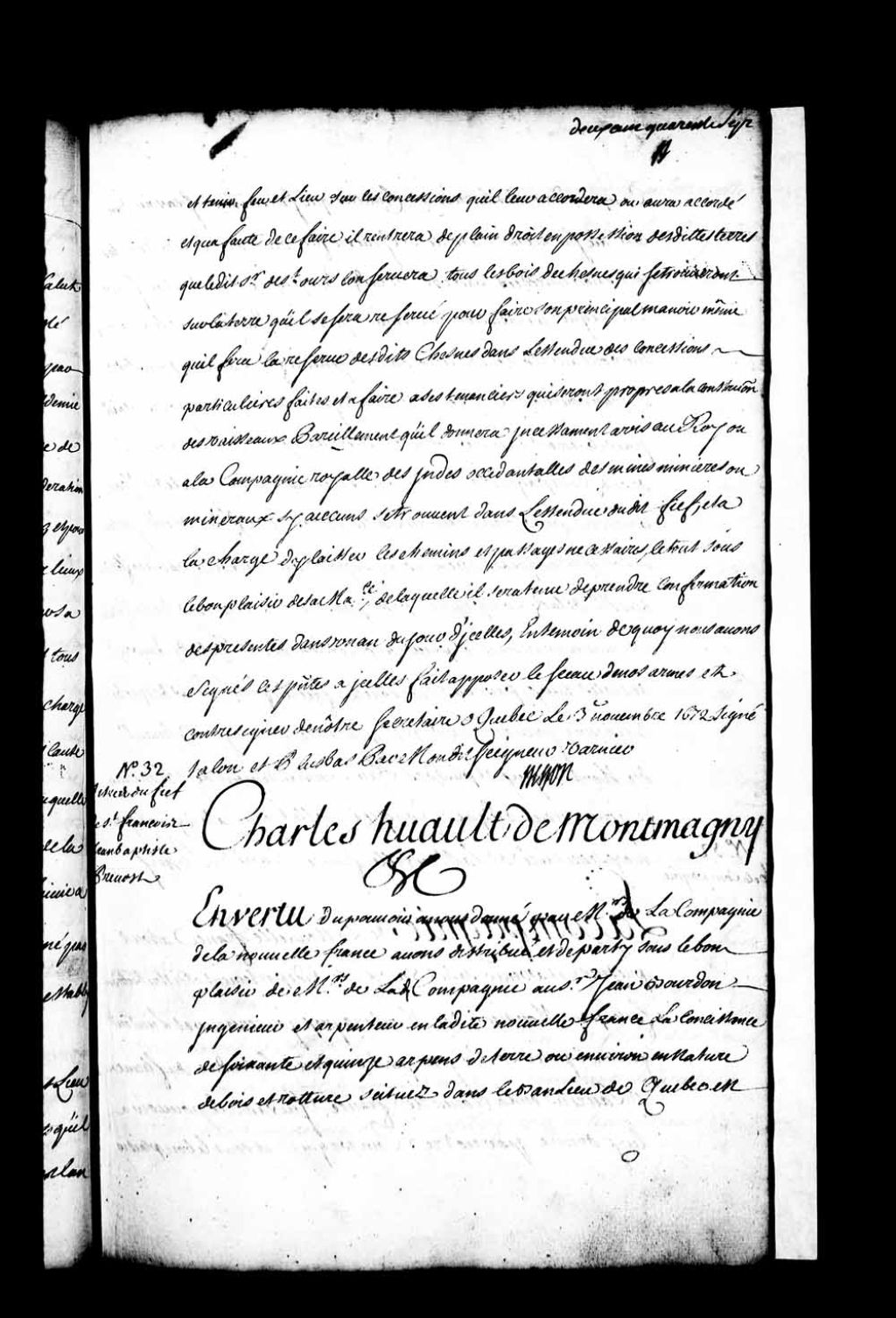 Acte de concession par monsieur de Montmagny, pour la Compagnie de la Nouvelle-France, au sieur Jean Bourdon, ingénieur et arpenteur en Nouvelle-France, de la consistance de soixante-quinze arpents de terre ou environ, en nature de bois et roture, situés dans la banlieue de Québec, et compris dans les bornes et limites qui s'ensuivent, à savoir d'un côté, au sud-ouest, la route Sainte-Geneviève, d'un côté, au nord-est, les terres non concédées, d'un bout, au sud-est, une ligne parallèle du chemin qui va de Québec vers le Cap-Rouge, d'un bout, au nord-ouest, le coteau Sainte-Geneviève, en titre de fief et seigneurie