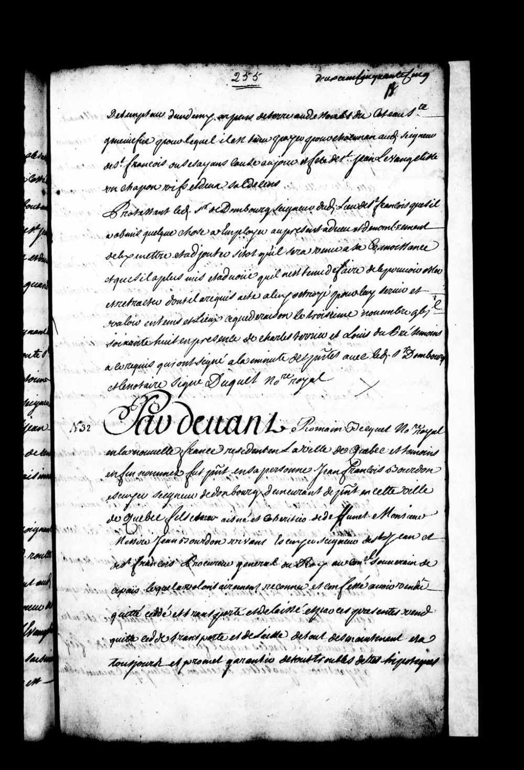 Contrat de vente par Jean-François Bourdon, écuyer, seigneur de Dombourg, fils aîné et cohéritier de feu Jean Bourdon, à Charles Bazire, receveur général des droits du Domaine du Roi en Nouvelle-France, du fief et terre appelé Saint-François, situé côte Sainte-Geneviève en la banlieue de la ville de Québec, avec toutes ses appartenances et dépendances (Notaire Romain Becquet)