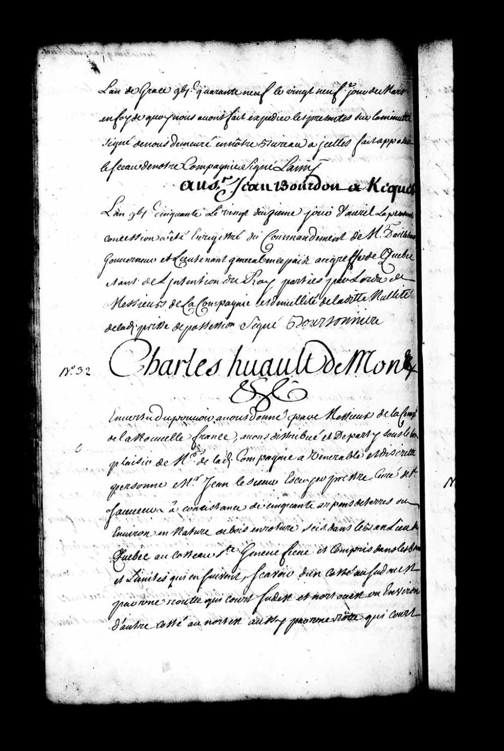 Acte de concession par Monseigneur de Montmagny, pour la Compagnie de la Nouvelle-France, au sieur Jean Le Sueur (LeSueur), écuyer, prêtre curé de Saint-Sauveur, de la consistance de cinquante arpents de terre ou environ sis dans la banlieue de Québec, au coteau Sainte-Geneviève, et compris dans les bornes et limites qui s'ensuivent, à savoir d'un côté, au sud-est, par une route qui court sud-est et nord-ouest, d'autre côté, au nord-est, aussi par une route qui court sud-est et nord-ouest, d'un bout, au sud-est, par une route éloignée de douze toises du grand chemin qui va de Québec au Cap-Rouge, d'autre bout, au nord-ouest, par le coteau Sainte-Geneviève, lesquelles routes sont de dix-huit pieds de large et qui serviront de chemin