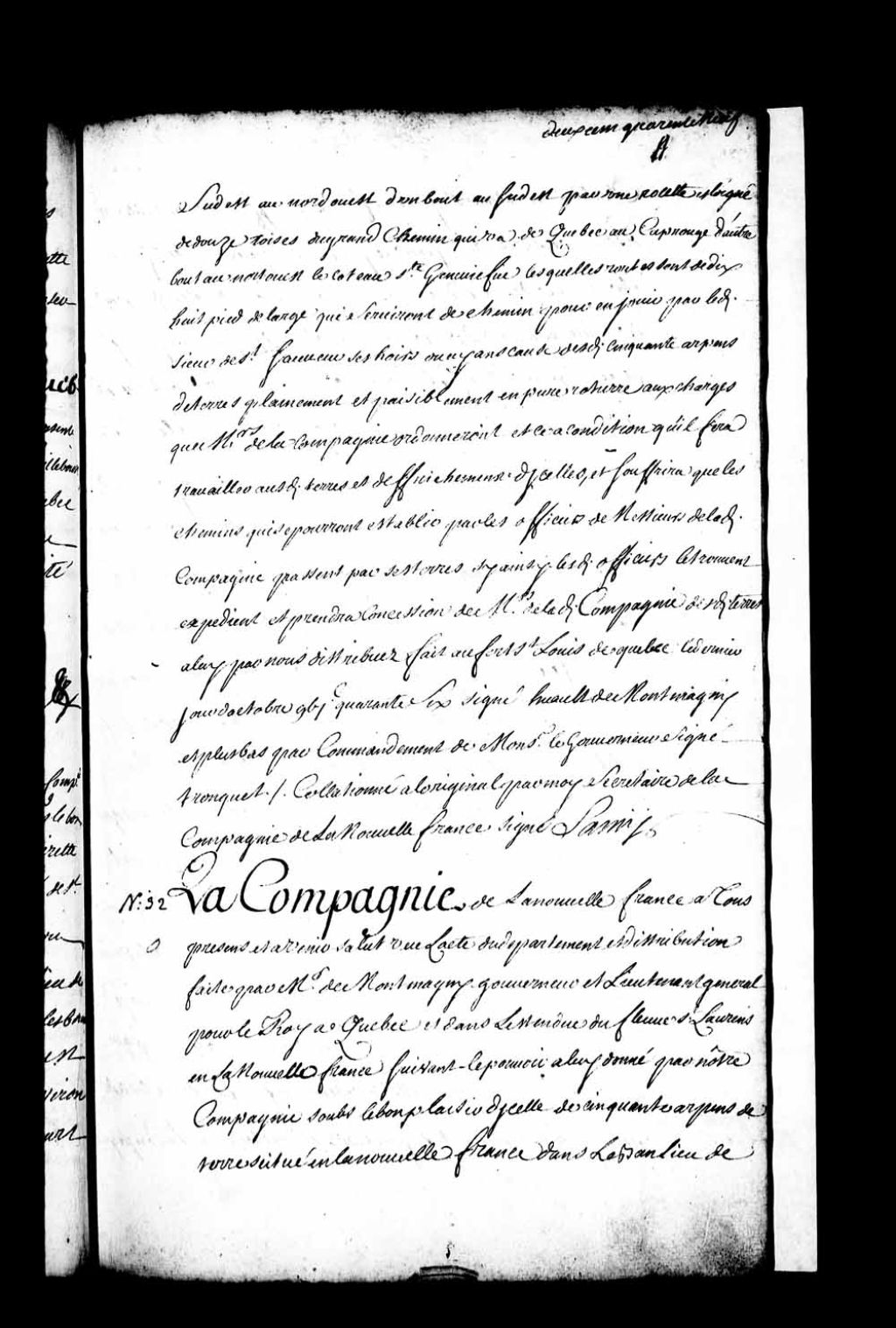 Mandement des messires de la Compagnie de la Nouvelle-France pour mettre messire Jean Le Sueur (LeSueur), curé de Saint-Sauveur, en possession de la concession à lui accordée par ladite Compagnie de la Nouvelle-France le 31 octobre 1646, 29 mars 1649, Archives nationales à Québec, Fonds Intendants, (03Q,E1,S4,SS1,D77,P4).