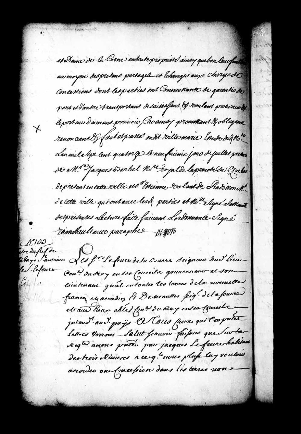 Acte de concession par Joseph-Antoine Lefebvre de La Barre et Jacques de Meulles, gouverneur et intendant de la Nouvelle-France, à Jacques Lefebvre, habitant des Trois-Rivières, d'une terre d'environ deux lieues de front joignant au nord-est la terre du sieur de Cressé, au sud-ouest celle du sieur de Lussaudière, au nord-ouest le lac Saint-Pierre, sur pareille quantité de profondeur à prendre dans les bois vis-à-vis ladite largeur, en titre de fief et seigneurie