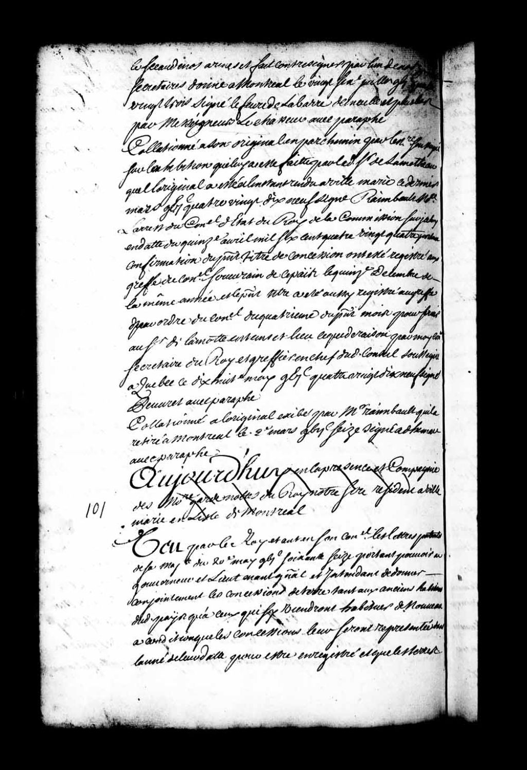 Brevet de confirmation par Sa Majesté de la concession faite à monsieur de La Motte (LaMotte, Lamothe) de Lucière de la concession que tenait le sieur de la Lussaudière, laquelle concession ayant été faite le 26 juillet 1683 par messires Lefebvre de La Barre et de Meulles, gouverneur et intendant