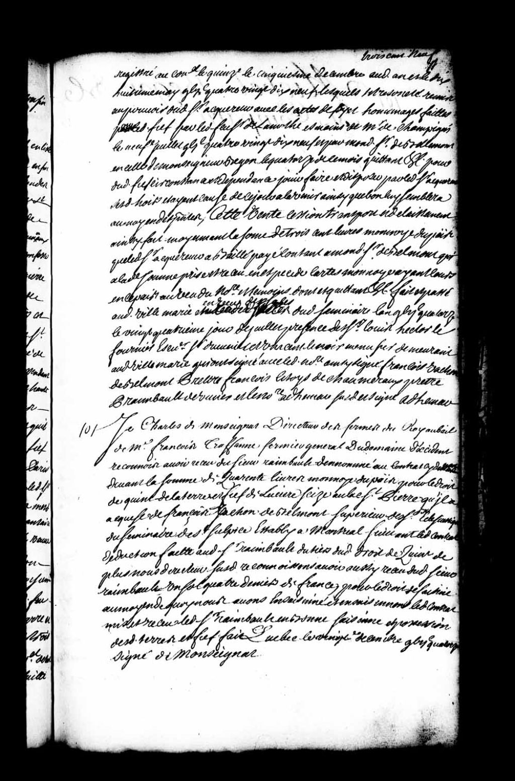 Reçu pour le paiement des droits de quint dus au Roi par le sieur Raimbault, suite à l'acquisition de la seigneurie de Lussière de François Vachon de Belmont, supérieur du Séminaire de Montréal