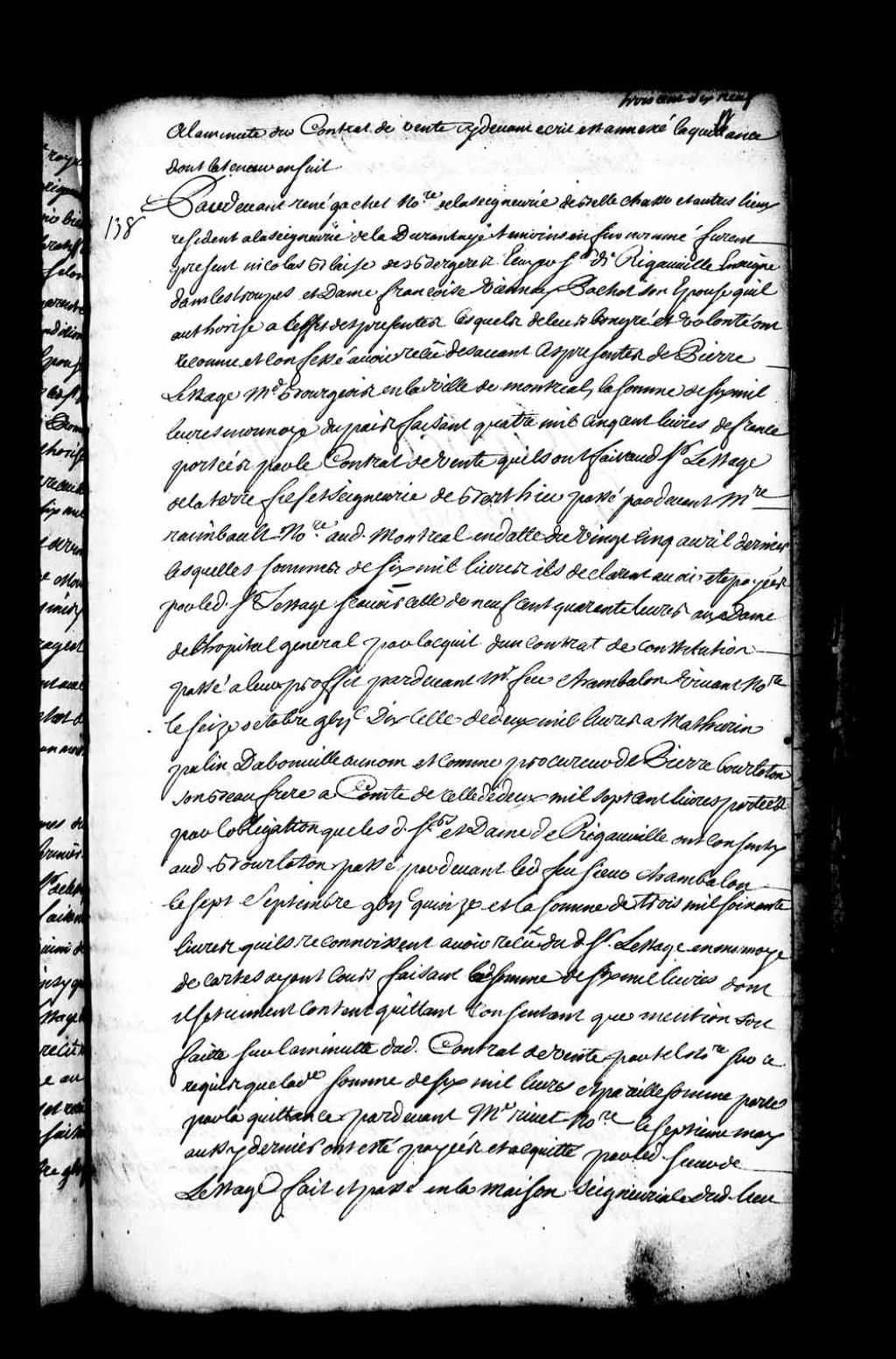 Quittance de Blaise des Bergères de Rigauville et Marie-Françoise Vianney (Viennay) Pachot, sa femme, à Pierre de Lestage quant à la somme de six mille livres, consistant au prix de la vente de la seigneurie de Berthier consentie par eux audit de Lestage (Notaire René Gaschet), 8 novembre 1718, Archives nationales à Québec, Fonds Intendants, (03Q,E1,S4,SS1,D92,P14).