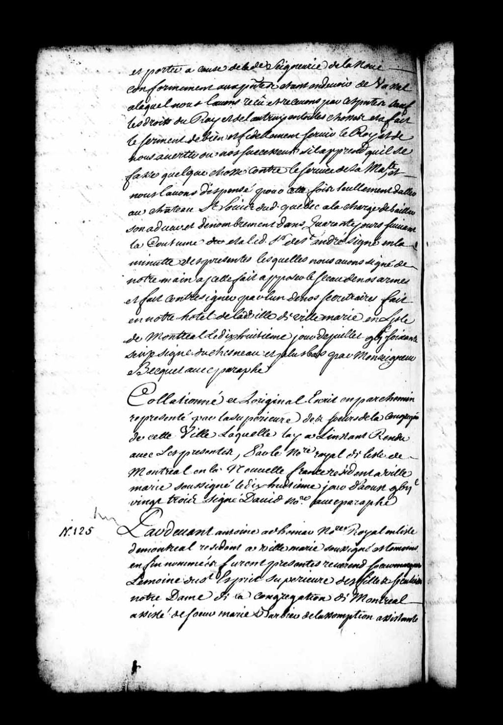 Contrat d'échange entre les Filles Séculières Notre-Dame de la Congrégation de Montréal, d'une part, et Zacharie Robutel de La Noue (LaNoue), lieutenant dans les troupes du détachement de la Marine demeurant au Château Guay (Châteauguay), et Catherine Lemoyne (Lemoine), son épouse, d'une terre sise dans la seigneurie de l'île de Montréal ainsi qu'une prairie dans la seigneurie de Saint-François, en retour des deux tiers du fief de La Noue situé dans l'île Saint-Paul, respectivement (Notaire Antoine Adhémar dit Saint-Martin)