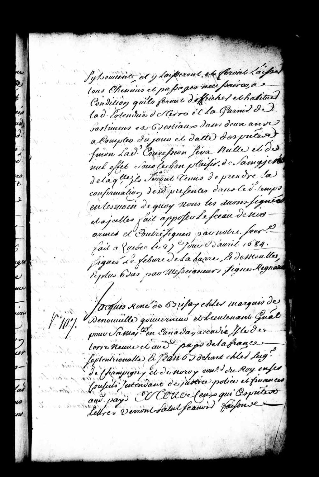 Acte de concession par Jacques-René de Brisay, Marquis de Denonville, gouverneur, et par Jean Bochart Champigny, intendant de la Nouvelle-France, au sieur Rouer de la Cardonnière de l'étendue de deux lieues de terre de front sur le fleuve Saint-Laurent, depuis la concession du Bic, appartenant au sieur de Vitré, en descendant ledit fleuve, avec deux lieues de profondeur dans les terres, ladite concession comprenant en outre la rivière dite de Rimouski et les autres rivières et ruisseaux, si personne ne se trouve dans ladite étendue, avec l'île de Saint-Barnabé et les battures, îles et îlets entre lesdites terres et ladite île, afin d'en jouir à titre de fief et seigneurie