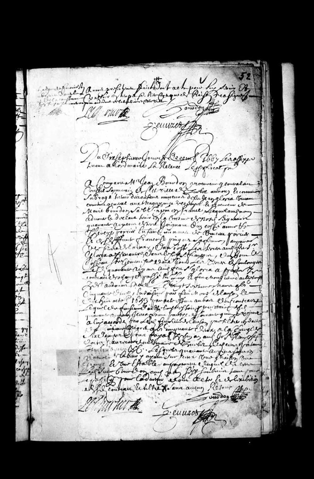 Transcription du texte avec orthographe modernisée : «Du dix-septième jour de décembre 1667, les assises tenant à l'ordinaire de relevée, le procureur fiscal présent. A comparu Messire Jean Bourdon, procureur général au Conseil Souverain de cette ville de Québec, au nom et comme subrogé tuteur des enfants mineurs de feu Jean Gloria, vivant commis général aux magasins de ce pays et procureur de Marie Bourdon, sa veuve, à présent en France, lequel au dit nom avoue tenir en la censive de nos dits seigneurs quarante arpents de terre joignant d'un côté Anne et Thérèse Poirier, enfants mineurs de Vincent Poirier et de défunte Françoise Pinguet, sa femme, auparavant veuve Pierre de Launay (Delaunay), d'autre côté les terres au dit feu Sieur Gloria appartenantes dans le fief Saint-François, d'un bout le coteau Sainte-Geneviève, d'autre bout les terres de Coulonges, les dits quarante arpents au dit feu Sieur Gloria appartenant par contrat d'échange passé entre lui et feu Monsieur Dailleboust (D'Ailleboust), par-devant Audouart (Audouard), notaire, le vingt-septième mars mille six cent cinquante-deux, ensaisiné par feu Monsieur de Lauson (Lauzon), le dix-huit octobre mille six cent cinquante-trois, par acte étant au bas du dit contrat, lequel dit feu Sieur Dailleboust (D'Ailleboust) était propriétaire des dits quarante arpents, iceux faisant partie de soixante-quinze arpents à lui accordés par le dit feu Sieur de Lauson (Lauzon) par titre en date du huitième mars mille six cent cinquante-deux à la charge de six deniers de cens payable par chacun an au jour Saint-Rémi chef d'octobre au receveur du domaine de Québec, le dit cens portant lods et ventes &. &., lesquels quarante arpents sont en nature de labour y ayant sur iceux une maison, une grange et une étable, au payement duquel dit cens le dit Sieur Bourdon au dit nom s'est soumis tant pour le passé que pour l'avenir, dont acte et de l'exhibition des dits contrats et titre et sans aucun retour. L. T. Chartier Bourdon Peuvret »