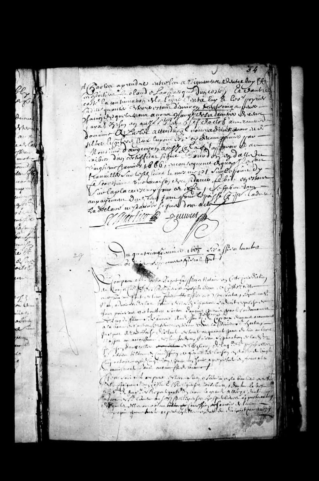 - Transcription du texte avec orthographe modernisée : «Du quatrième janvier 1668, les assises tenant à l'ordinaire, le procureur fiscal présent. A comparu maître Gilles Rageot, greffier et notaire en cette juridiction, au nom et comme procureur des religieuses hospitalières de cette ville, et se faisant et portant fort de leur faire ratifier ces présentes, lequel au dit nom avoue et déclare tenir de nos dits seigneurs le droit de pêche de tout poisson et en toutes sortes d'engins permis par les ordonnances le long du fleuve Saint-Laurent au-dessous de la côte du Cap aux Diamant, à commencer à la borne des mères Ursulines en tirant vers la rivière Saint-Charles jusqu'à une roche distante de trente ou quarante pas du lieu où leurs nasses ont accoutumé d'être tendues, faisant séparation de leur dite pêche d'avec celles de l'église, de laquelle dite pêche elles ont obtenu titre de concession de feu Monsieur de Lauson (Lauzon), en date du [...]