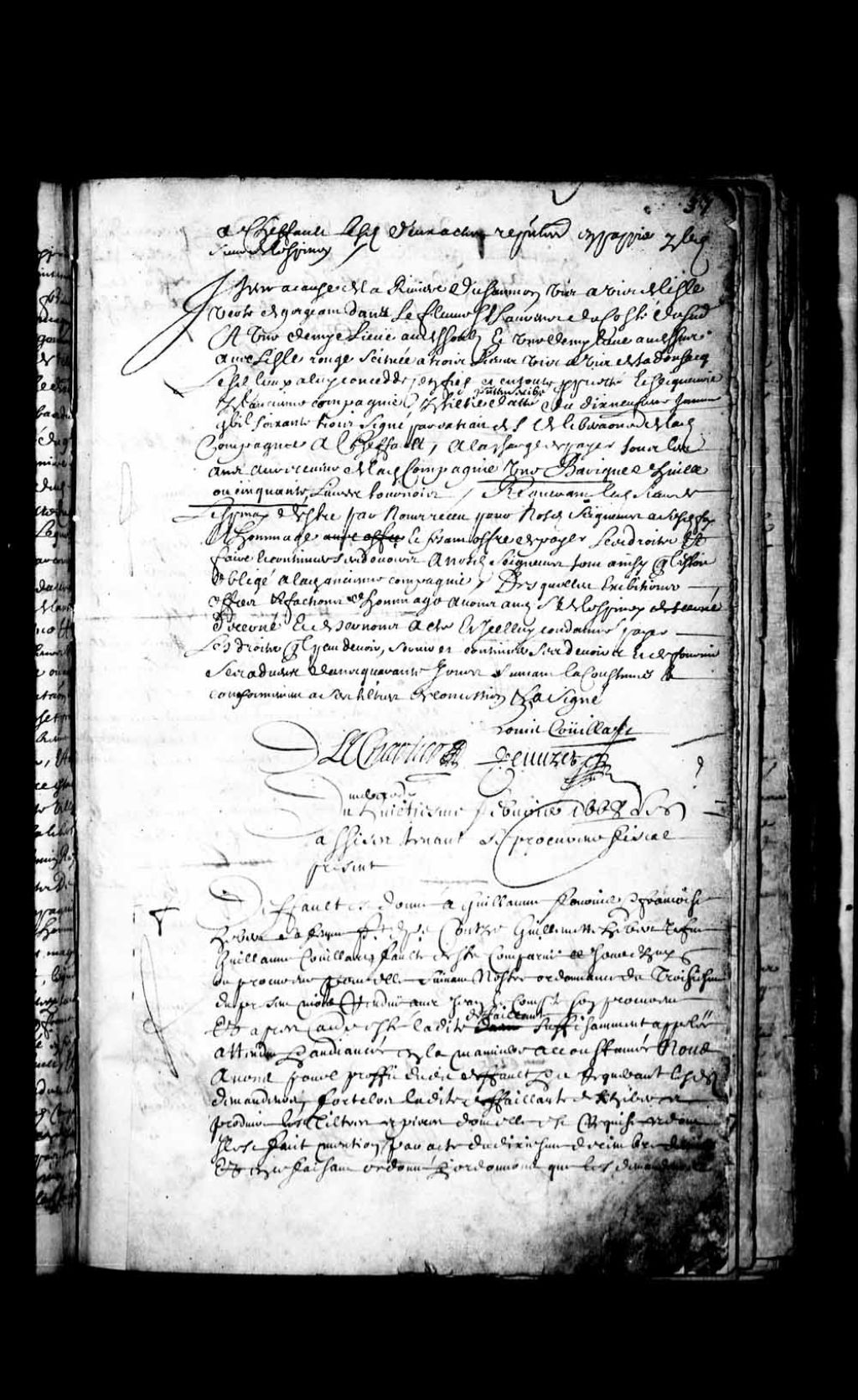 - Transcription du texte avec orthographe modernisée : «Du mercredi huitième février 1668, les assises tenant, le procureur fiscal présent. Défaut est donné à Guillaume Fournier et Françoise Hébert, sa femme présents, demandant contre Guillemette Hébert, veuve Guillaume Couillard, faute d'être comparu ce jourd'hui ou procureur pour elle suivant notre ordonnance du troisième du présent mois rendu avec Jean Lecompte, son procureur, et après avoir été la dite défaillante suffisamment appelée attendu l'audience en la manière accoutumée nous avons prouvé profit du dit défaut et ce requérant les dits demandeurs forclos la dite défaillante d'exhiber et produire les titres et pièces dont elle est requise et dont il est fait mention par acte du dixième décembre dernier et en ce faisant ordonné et ordonnons que les demandeurs mettront par devers nous leurs demandes et pièces dans huitaine pour leur être fait droit sur icelles ainsi qu'il appartiendra pendant lesquels la dite défaillante pourra produire si bon Ouï semble ce qu'elle avisera bon être et soit signifié. Mandons & L. T. Chartier »