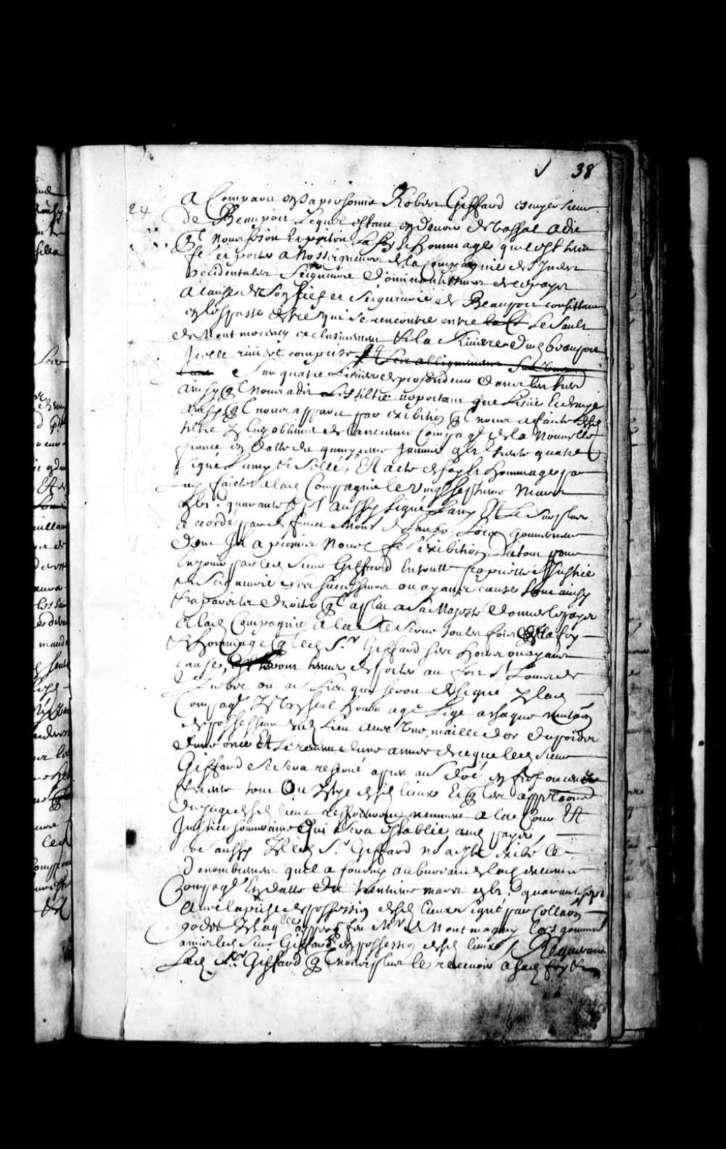 - Transcription du texte avec orthographe modernisée : «Du 22 février 1668. A comparu en sa personne Robert Giffard, écuyer, Sieur de Beauport, lequel étant en devoir de vassal, a dit qu'il nous faisait et portait la foi et hommage qu'il est tenue faire et porter à nos seigneurs de la Compagnie des Indes Occidentales, seigneurs dominantissimes de ce pays, à cause de son fief et seigneurie de Beauport, consistant en l'espace de terre qui se rencontre entre le Sault de Montmorency exclusivement et la rivière du dit Beauport, icelle rivière comprise sur quatre lieues de profondeur dans les terres ainsi qu'il nous a dit les titres ne portant que lieue et demie ainsi qu'il nous a paru par exhibition qu'il nous a faite des dits titres par lui obtenus de l'ancienne Compagnie de la Nouvelle-France en date du quinzième janvier mille six cent trente-quatre, signé Lamy, et scellé, et acte de foi et hommage par lui faite à la dite Compagnie le vingt-septième mars mille six cent quarante-sept, aussi signé Lamy, et le surplus accordé par défunt Monsieur de Lauson (Lauzon) lors gouverneur dont il a promis nous faire exhibition, du tout pour en jouir par le dit Sieur Giffard en toute propriété, justice et seigneurie, ses successeurs ou ayant cause tout et ainsi et à pareil droits qu'il a plu à Sa Majesté donner le pays à la dite Compagnie à la réserve toutefois de la foi et hommage que le dit Sieur Giffard, ses hoirs ou ayant cause seront tenus de porter au fort Saint-Louis de Québec ou autre lieu qui serait désigné par la dite Compagnie par un seul hommage lige à chaque mutation de possesseur du dit lieu avec une maille d'or du poids d'un once et le revenu d'une année de ce que le dit Sieur Giffard se sera réservé après avoir donné en fief ou en rente tous ou partie des dits lieux et que les appellations du juge des dits lieux ressortiront nuement à la cour et justice souveraine qui sera établie au dit pays, comme aussi par le dit Sieur Giffard nous a été exhibé le dénombrement qu'il a fourni au bureau de la dite ancienne Compagnie en date du trentième mars mille six cent quarante-sept avec la prise de possession des dits lieux signé par collation Godet par laquelle appert que feu Monsieur de Montmagny, lors gouverneur, a mis le dit Sieur Giffard en possession des dits lieux, requérant le dit Sieur Giffard qu'il nous plût le recevoir à la dite foi et hommage. Item, le dit Sieur Giffard a aussi déclaré tenir à foi et hommage, de nos dits seigneurs trois lieues de front sur le fleuve Saint-Laurent, du côté du nord, au-dessous de Tadoussac et des grandes et petites Bergeronnes, au lieu dit mille vaches, avec quatre lieues de profondeur tenant par-devant sur le dit fleuve Saint-Laurent, et des trois autres côtés aux terres non concédées, les dites choses au dit Sieur Giffard appartenantes par titre de concession de Monsieur de Lauson (Lauzon), lors gouverneur, en date du quinzième novembre mille six cent cinquante-trois, pour en jouir par lui en fief et tous droits de haute, moyenne et basse justice et seigneurie, lui ses hoirs ou ayant cause, aux même droits que la dite ancienne Compagnie de la Nouvelle-France à la charge de la foi et hommage que lui ses hoirs ou ayant cause seront tenus de porter en cette juridiction de Québec par un seul hommage et pour rachat le revenu d'une année à chaque mutation de possesseur, et que les appellations du juge qui sera établi sur les lieux ressortiront en cette dite juridiction, requérant le dit Sieur Giffard qu'il nous plaise le recevoir à sa dite foi et hommage aux conditions susdites et a signé. R. Giffard. Sur quoi, Ouï le procureur fiscal qui a dit qu'il se déportait de conclure en cette affaire, nous laissant de lui substituer en icelle telle personne que nous jugerions à propos ou d'y prononcer d'office. Nous avons décerné acte au dit Sieur Giffard de ses dites foi et hommage et exhibition de titres à la charge des dits droits seigneuriaux et que les appellations de la juridiction de Beauport ressortiront nuement en cette juridiction, n'appartenant qu'au Roy de donner des privilèges et pareillement que celui par le dit Sieur Giffard prétendu de relever à la cour souveraine que Sa Majesté n'accorde qu'aux Ducs et pairs, et à la charge par le dit Sieur Giffard de fournir son dénombrement dans le temps de la coutume. Et à l'égard du fief du Mille-Vaches, attendu qu'il n'y a aucuns travaux faits sur les lieux, nous avons remis au Roy ou à la Compagnie de faire valoir le titre qu'en a obtenu le dit Sieur Giffard ou de le révoquer si bon leur semble. L. T. Chartier »