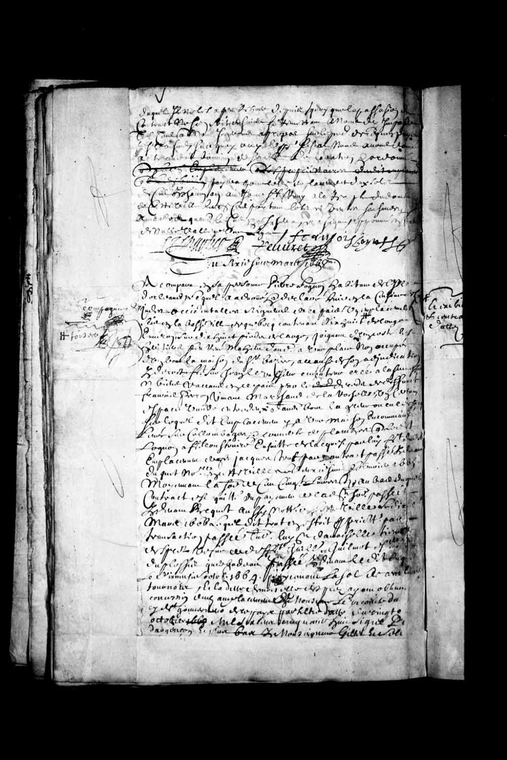 - Transcription du texte avec orthographe modernisée : «Du sixième mars 1668. A comparu en sa personne Pierre Lognon (Loignon), habitant de l'île d'Orléans, lequel a avoué et déclaré tenir en la censive de la Compagnie des Indes Occidentales, seigneurs de ce pays, un emplacement sis en la basse-ville de Québec, contenant dix-huit toises de long ou environ sur dix-huit pieds de large, joignant d'un côté les héritiers feu René Maheu (Maheux), d'autre à une place non occupée, d'un bout la maison du Sieur Bazire à cause de son adjudication par décret fait sur Jean Levasseur, curateur créé à la succession de biens vacants en ce pays par le décès de défunt François Perron, vivant marchand de La Rochelle, un certain espace vide entre deux, d'autre bout la grève ou Cul-de-Sac, sur lequel dit emplacement y a une maison encommencée levée sur colombage et couverte de planches que le dit Lognon a fait construire ensuite de l'acquêt par lui fait du [...]