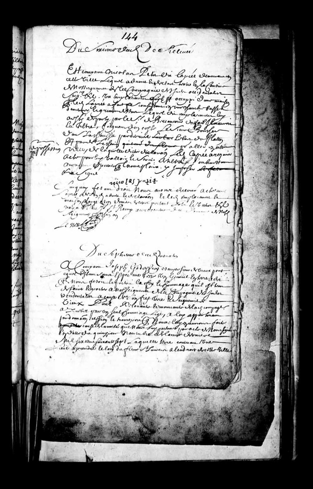 Transcription du texte avec orthographe modernisée : «Du septième du dit, du matin (7 juillet 1668) A comparu Joseph Godefroy, écuyer, Sieur de Vieux-pont, lequel étant sans épée, nue tête, un genou en terre, a dit qu'il nous faisait et portait la foi et hommage qu'il est tenu de faire et porter à nos seigneurs de la Compagnie des Indes Occidentales à cause de son fief, terre et seigneurie de Vieux-Pont, relevant et mouvante de la dite Compagnie à Québec par un seul hommage lige, à lui appartenant par donation, cession et transport que nous lui en aurions faits à cause de l'amitié que nous lui portons par acte de nous signé en date du quinzième novembre de l'année dernière mille six cent soixante-sept, laquelle terre contenant une lieue à prendre le long du fleuve Saint-Laurent, à l'endroit de cette ville des Trois-Rivières, en remontant le dit fleuve sur sept lieues de profondeur dans les terres, nous appartenait par concession qui [...]
