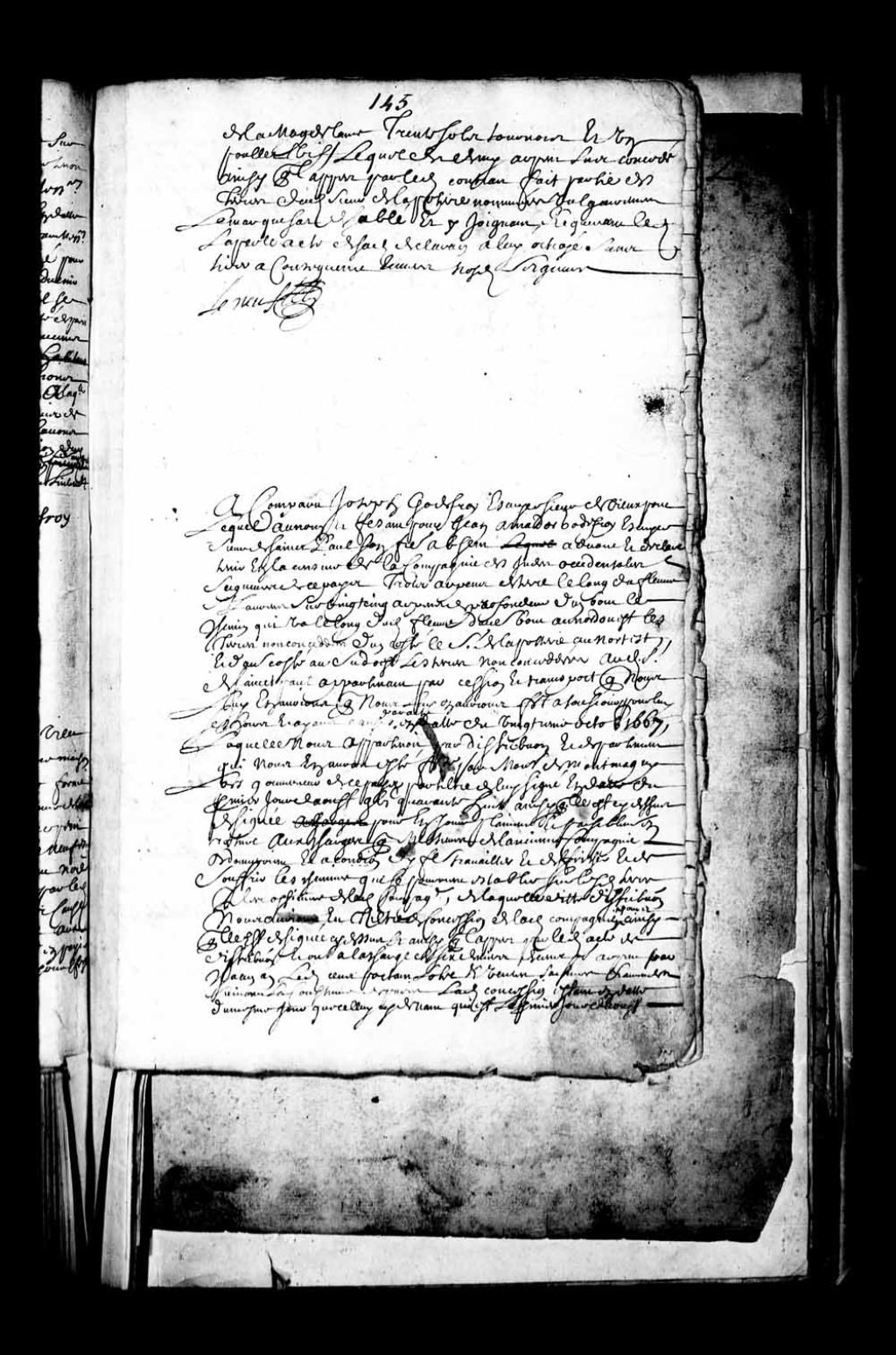 - Transcription du texte avec orthographe modernisée : «A comparu Joseph Godefroy, écuyer, Sieur de Vieuxpont, lequel au nom et faisant pour Jean Amador Godefroy, écuyer, Sieur de Saint-Paul, son frère, absent, avoue et déclare tenir en la censive de la Compagnie des Indes Occidentales, seigneurs de ce pays, trois arpents de terre le long du fleuve Saint-Laurent sur vingt-cinq arpents de profondeur, d'un bout le chemin qui va le long du dit fleuve, d'autre bout au nord-ouest les terres non concédées, d'un côté le Sieur de la Poterie (LaPoterie) au nord-est, et d'autre côté au sud-est les terres non concédées, au dit Sieur de Saint-Paul appartenant par cession et transport que nous lui en aurions faits à toujours pour lui ses hoirs et ayant cause par acte en date du vingtième octobre mille six cent soixante-sept, laquelle nous appartenait par distribution et départissement qui nous en aurait été faite par Monsieur de Montmagny, lors [...]