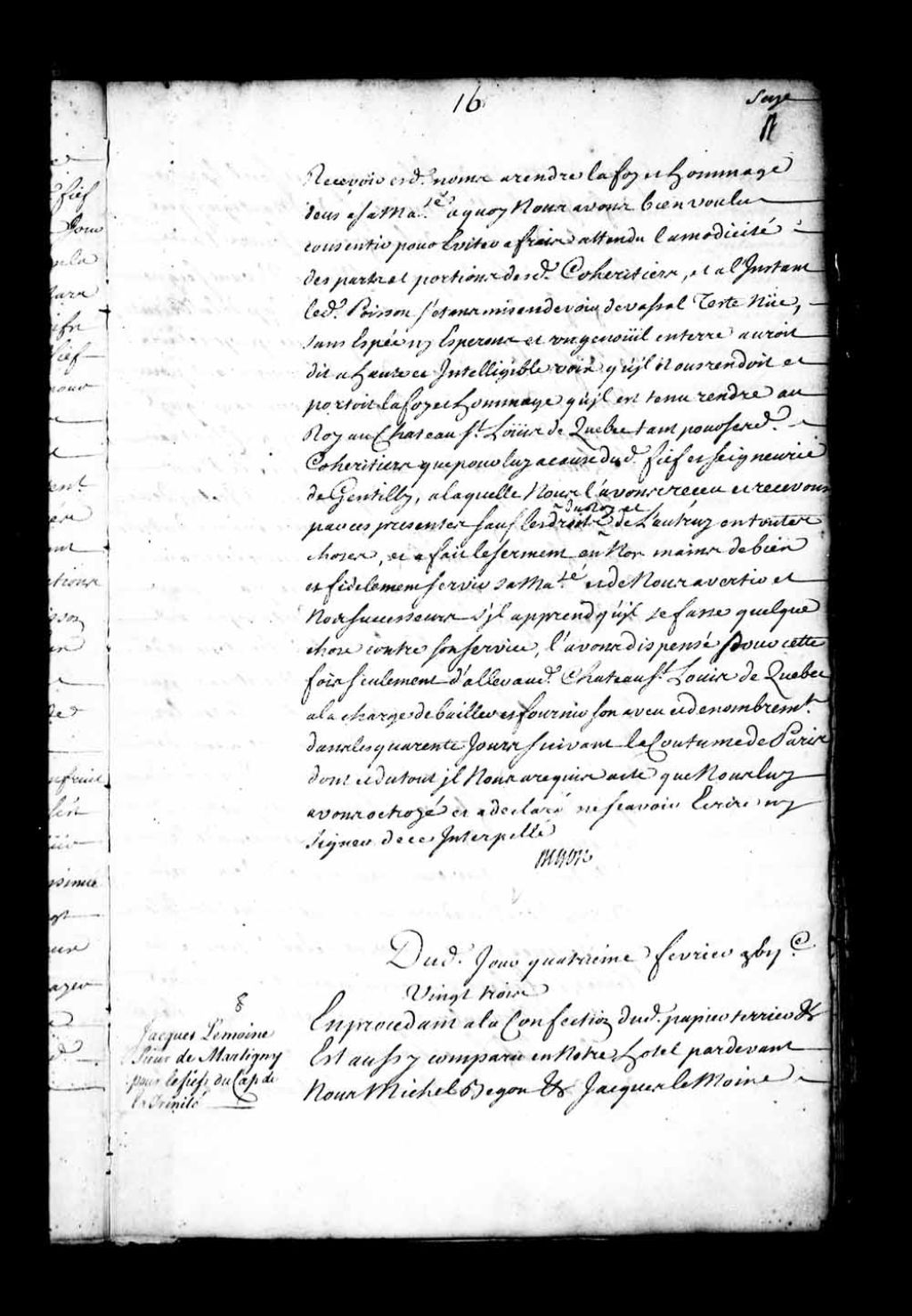 Acte de foi et hommage fait devant Michel Bégon par Jacques Lemoine (Lemoyne), sieur de Martigny, fils unique et seul héritier de feu Jean-Baptiste Lemoyne, de son vivant sieur de Martigny, lequel avait les droits cédés de ses frères et soeurs, tous héritiers de feu Jacques Lemoyne, de son vivant seigneur du fief vulgairement nommé Cap-de-la-Trinité, pour ledit fief et seigneurie de Cap-de-la-Trinité