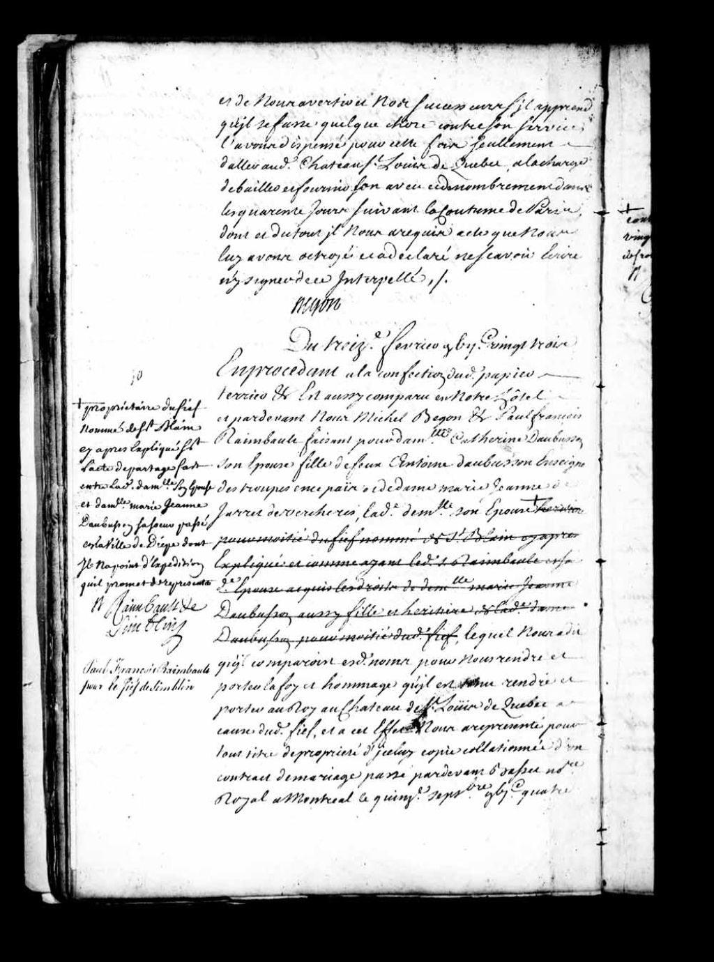 Acte de foi et hommage fait devant Michel Bégon par Paul-François Raimbault, faisant pour damoiselle Catherine d'Aubusson, son épouse, fille de feu Antoine d'Aubusson, de son vivant enseigne des troupes en Nouvelle-France, et de dame Marie-Jeanne Jarret de Verchères, pour le fief et seigneurie de Simblin (Saint-Blain)