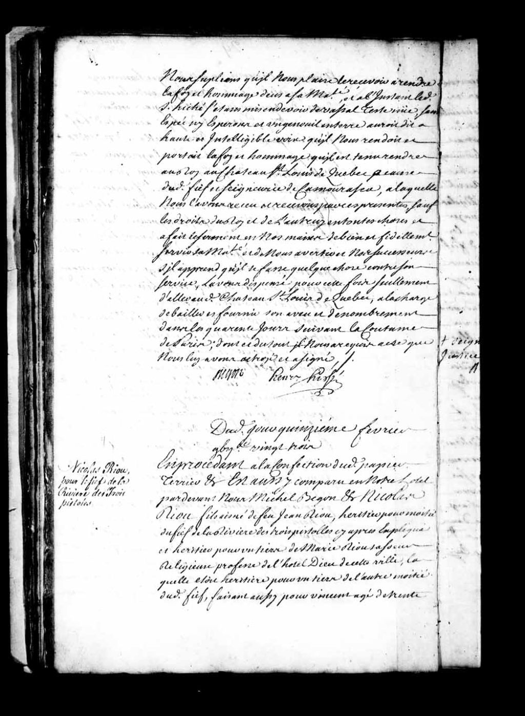 Acte de foi et hommage de Nicolas Riou (Rioux), fils aîné de feu Jean Riou (Riou), héritier pour moitié du fief de la Rivière-des-Trois-Pistoles et héritier pour un tiers de Marie Riou (Rioux), sa soeur, religieuse à l'Hôtel-Dieu de Québec, héritière pour un tiers de l'autre moitié dudit fief, faisant aussi pour Vincent Riou et Pierre Riou (Rioux), ses frères, héritiers de feu leur père pour chacun un tiers de ladite autre moitié dudit fief, et encore pour chacun un tiers dans la part de ladite Marie Riou (Rioux), leur soeur, lequel acte de foi et hommage étant fait pour ledit fief de la Rivière-des-Trois-Pistoles
