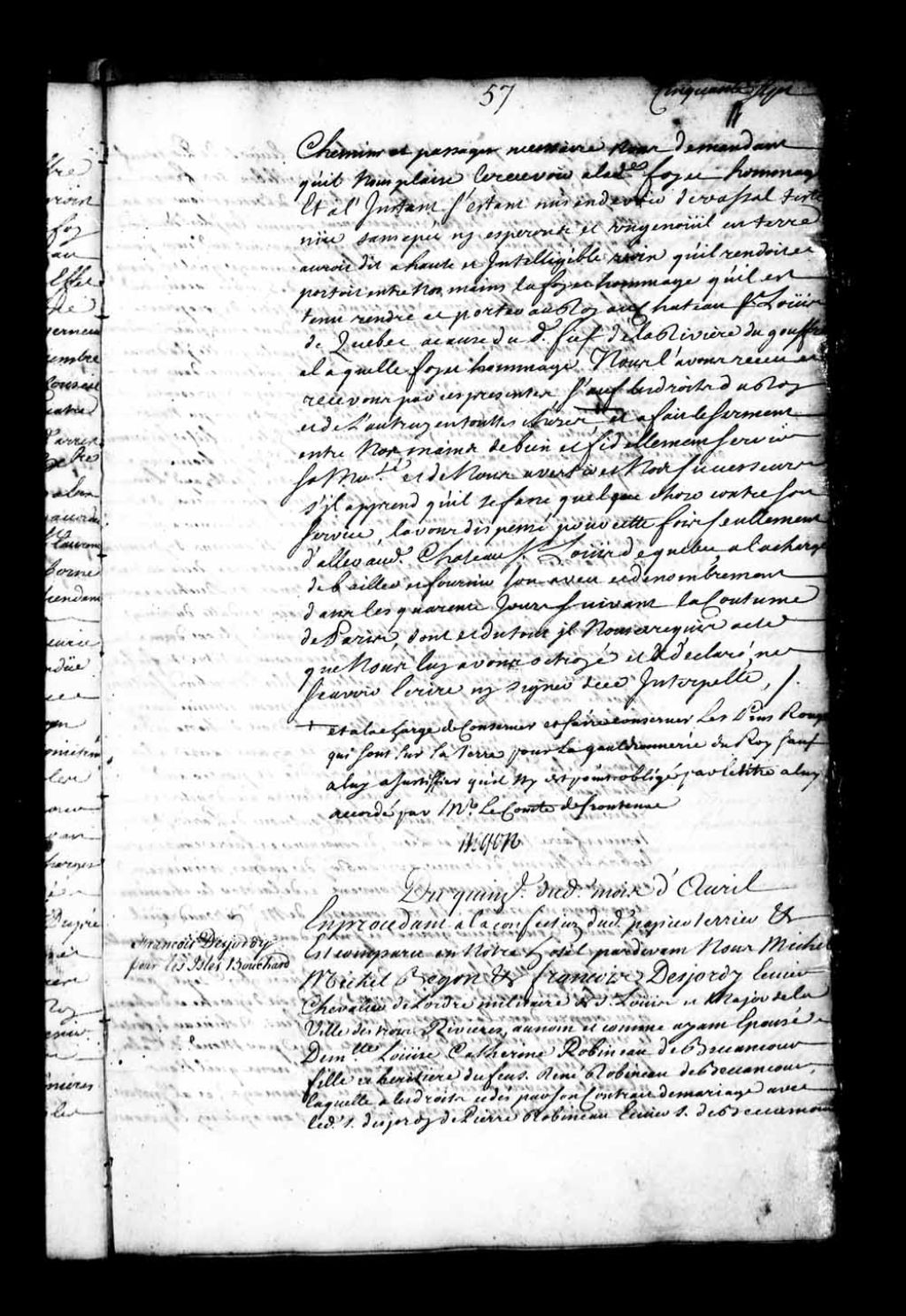 Acte de foi et hommage de François Desjordy, écuyer, Chevalier de l'Ordre militaire de Saint-Louis et major des Trois-Rivières, au nom et comme ayant épousé Louise-Catherine Robineau de Bécancour, fille et héritière de feu René Robineau de Bécancour, pour le fief et seigneurie des îles Bouchard concédé à monsieur Robineau de Fortelle (Fortelles) par messire Talon le 29 octobre 1672
