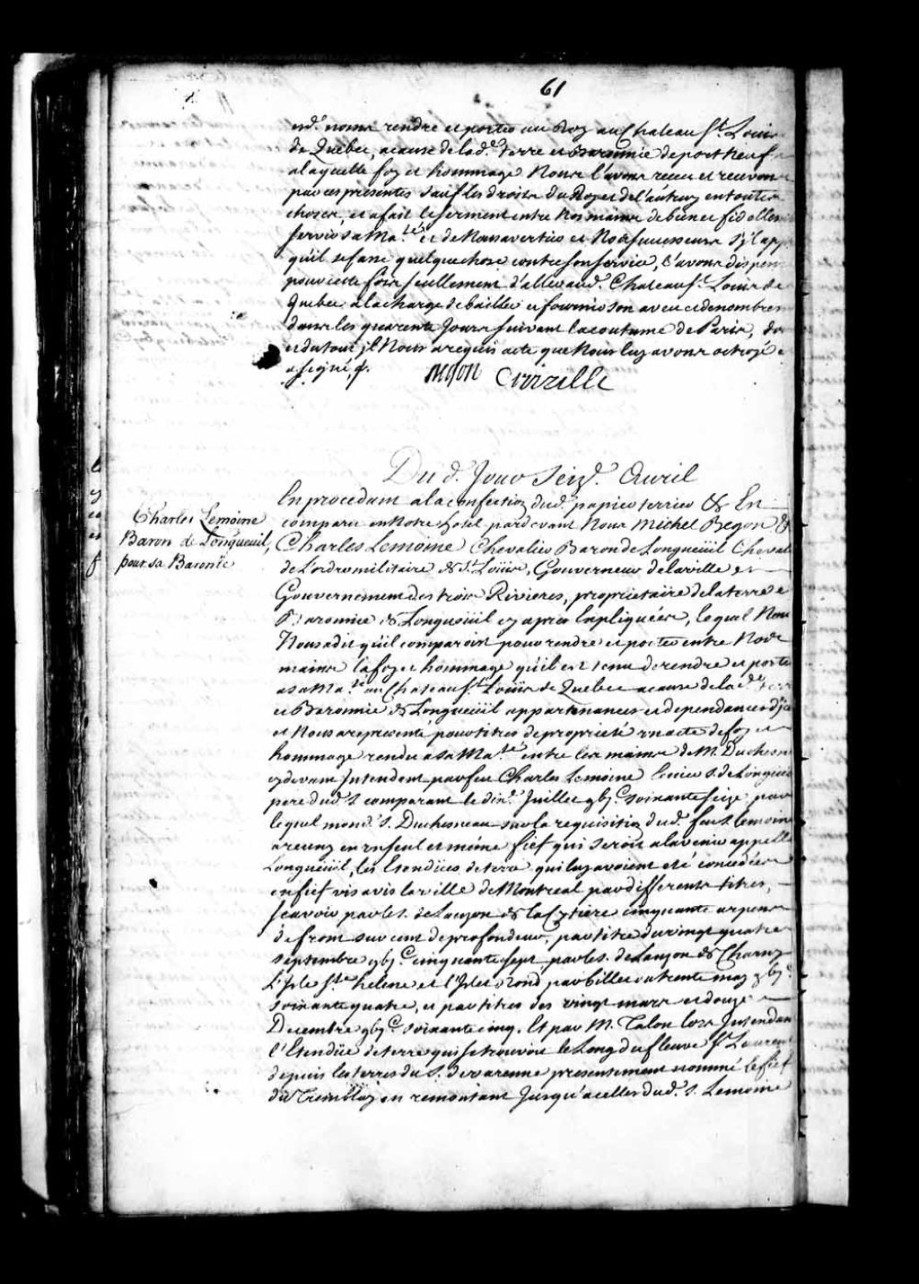 Acte de foi et hommage de Charles Lemoyne (Lemoine), Baron de Longueuil, Chevalier de l'Ordre militaire de Saint-Louis et gouverneur de la ville et gouvernement des Trois-Rivières, pour la baronnie de Longueuil