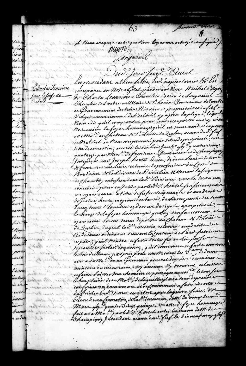Acte de foi et hommage de Charles Lemoyne (Lemoine), Baron de Longueuil, Chevalier de l'Ordre militaire de Saint-Louis et gouverneur de la ville et gouvernement des Trois-Rivières, pour le fief vulgairement nommé Beloeil