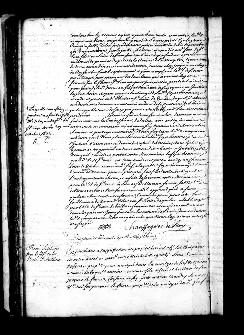 Acte de foi et hommage du sieur René Lefebvre, propriétaire de la moitié de la moitié du fief nommé la Baie-Saint-Antoine, fils aîné et héritier de feu Jacques Lefebvre, faisant aussi pour la veuve Marie Beaudry (Baudry), sa mère, propriétaire de la moitié dudit fief, et pour ses frères et soeurs, héritiers pour chacun un sixième dans l'autre moitié dudit fief, lequel avait été concédé par messires Lefebvre de La Barre et de Meulles le 4 septembre 1683, lequel acte de foi et hommage étant fait pour ledit fief de la Baie-Saint-Antoine