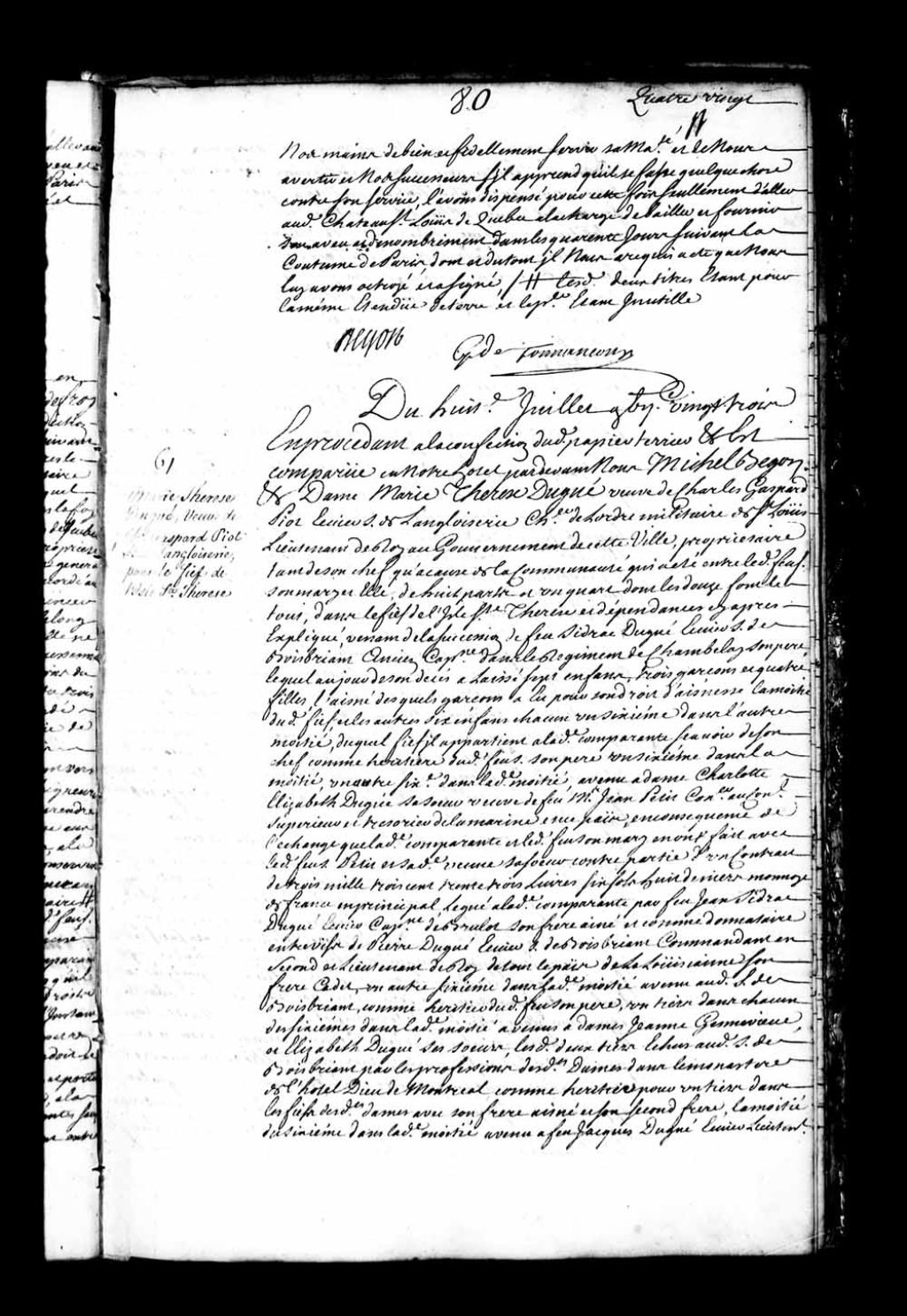 Acte de foi et hommage de dame Marie-Thérèse Dugué (Duguay), veuve de feu Charles-Gaspard Piot, de son vivant écuyer, sieur de Langloiserie, Chevalier de l'Ordre militaire de Saint-Louis et lieutenant du Roi à Québec, propriétaire tant de son chef qu'à cause de la communauté qui a été entre elle et son mari de huit parts et un quart dont les douze font le tout dans le fief de l'île Sainte-Thérèse, venant de la succession de feu Sidrac Dugué, de son vivant écuyer, sieur de Boisbriand, lequel laissa trois garçons et quatre filles, l'aîné des garçons ayant, vu son droit d'aînesse, la moitié dudit fief et les autres six enfants chacun un sixième dans l'autre moitié, lequel acte de foi et hommage étant fait pour ladite portion du fief de l'île Sainte-Thérèse