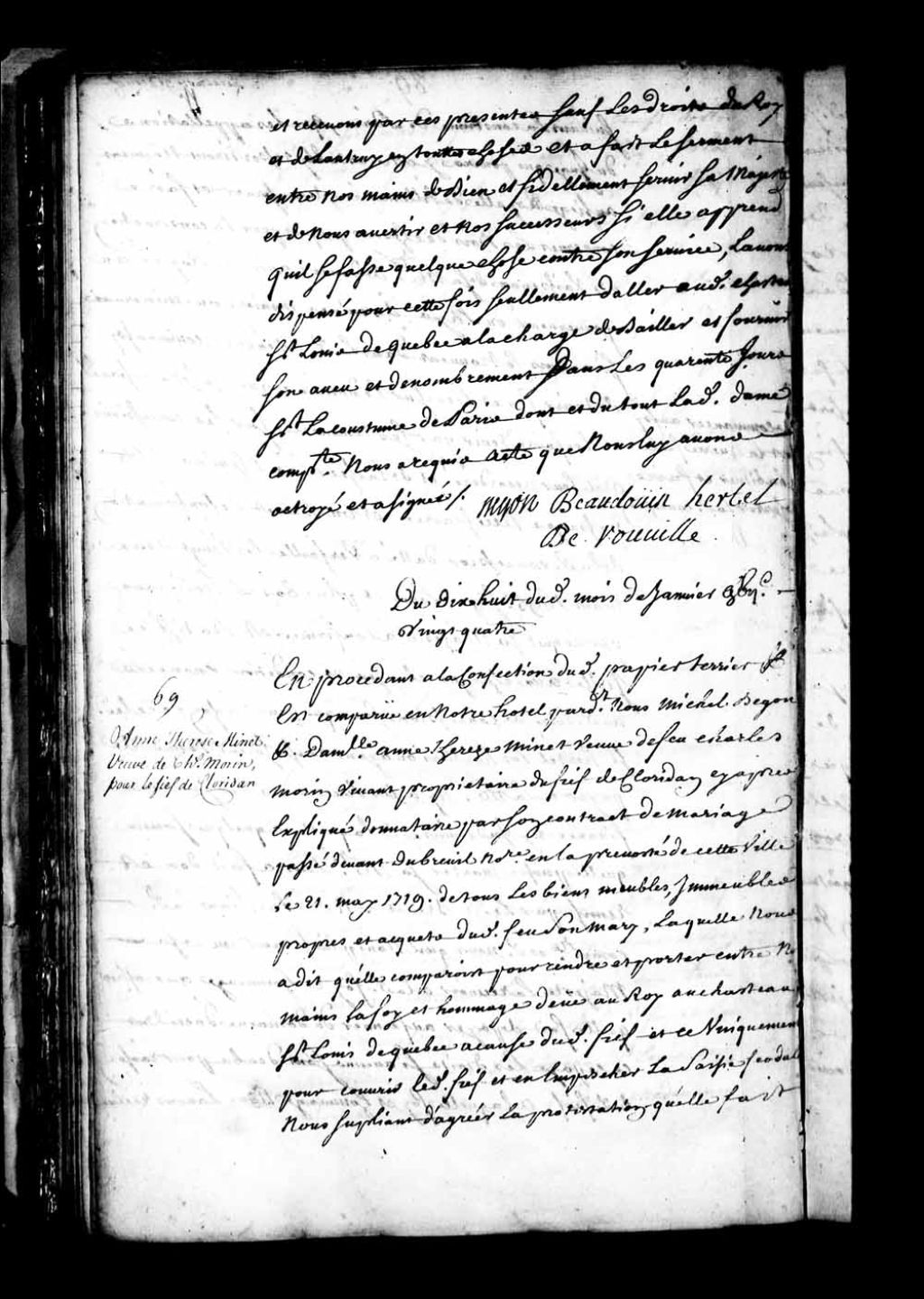 Acte de foi et hommage d'Anne-Thérèse Minet, veuve de feu Charles Morin, de son vivant propriétaire du fief de Cloridan, qui avait été concédé par messires de Vaudreuil et Raudot le 2 mai 1707, lequel acte de foi et hommage étant fait pour ledit fief de Cloridan