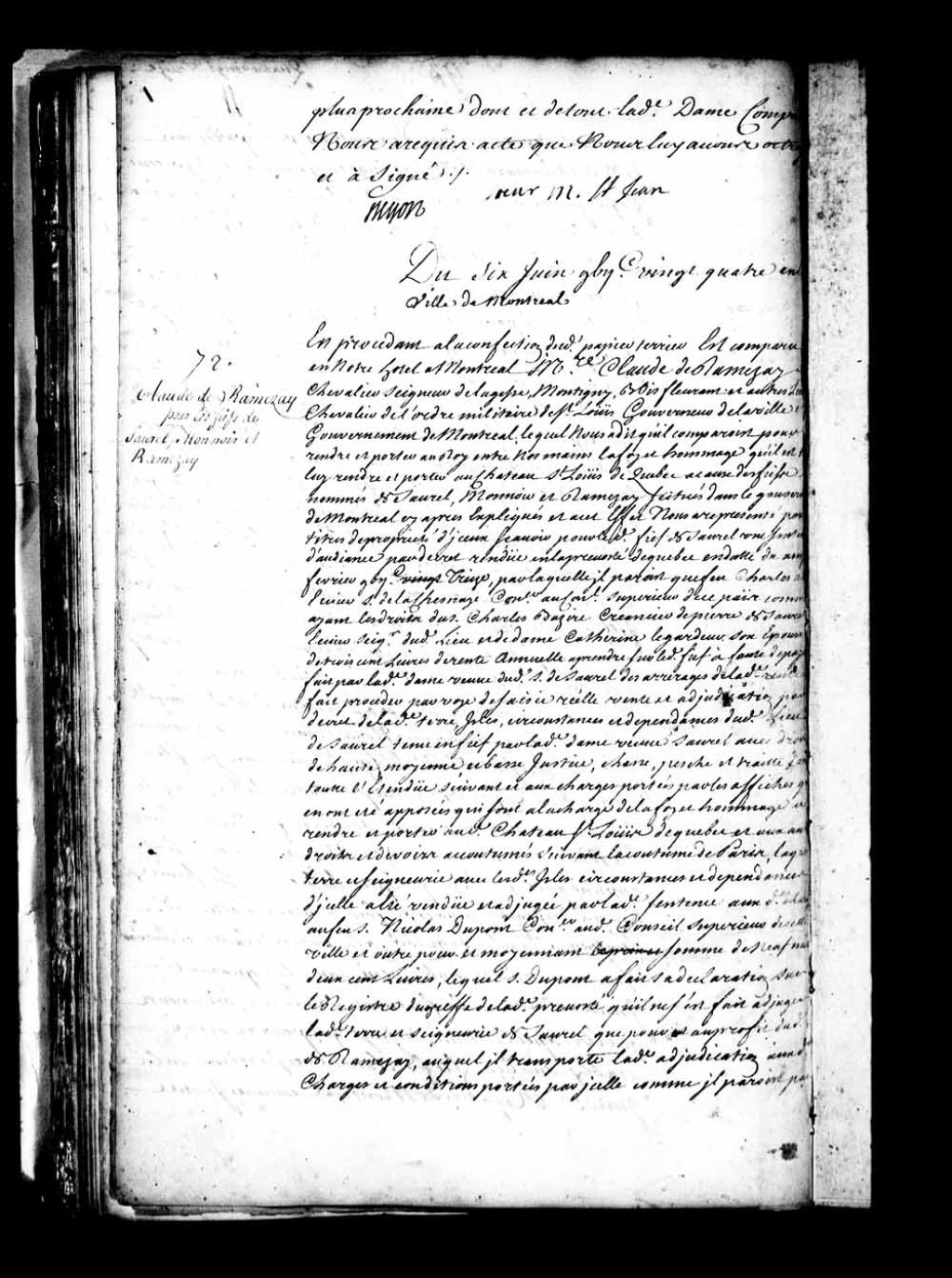 Acte de foi et hommage de Claude de Ramezay, Chevalier, seigneur de LaGesse, Montigny, Boisfleurant et autres lieux, Chevalier de l'Ordre militaire de Saint-Louis et gouverneur de Montréal, pour le fief et seigneurie de Saurel (Sorel) qu'il a acquis de feu Nicolas Dupont de Neuville qui le tenait par adjudication de la Prévôté de Québec du 14 février 1713, ainsi que pour les fiefs et seigneuries de Monnoir et de Ramezay à lui concédés le 25 mars 1708 et le 17 octobre 1710 par messires de Vaudreuil et Raudot