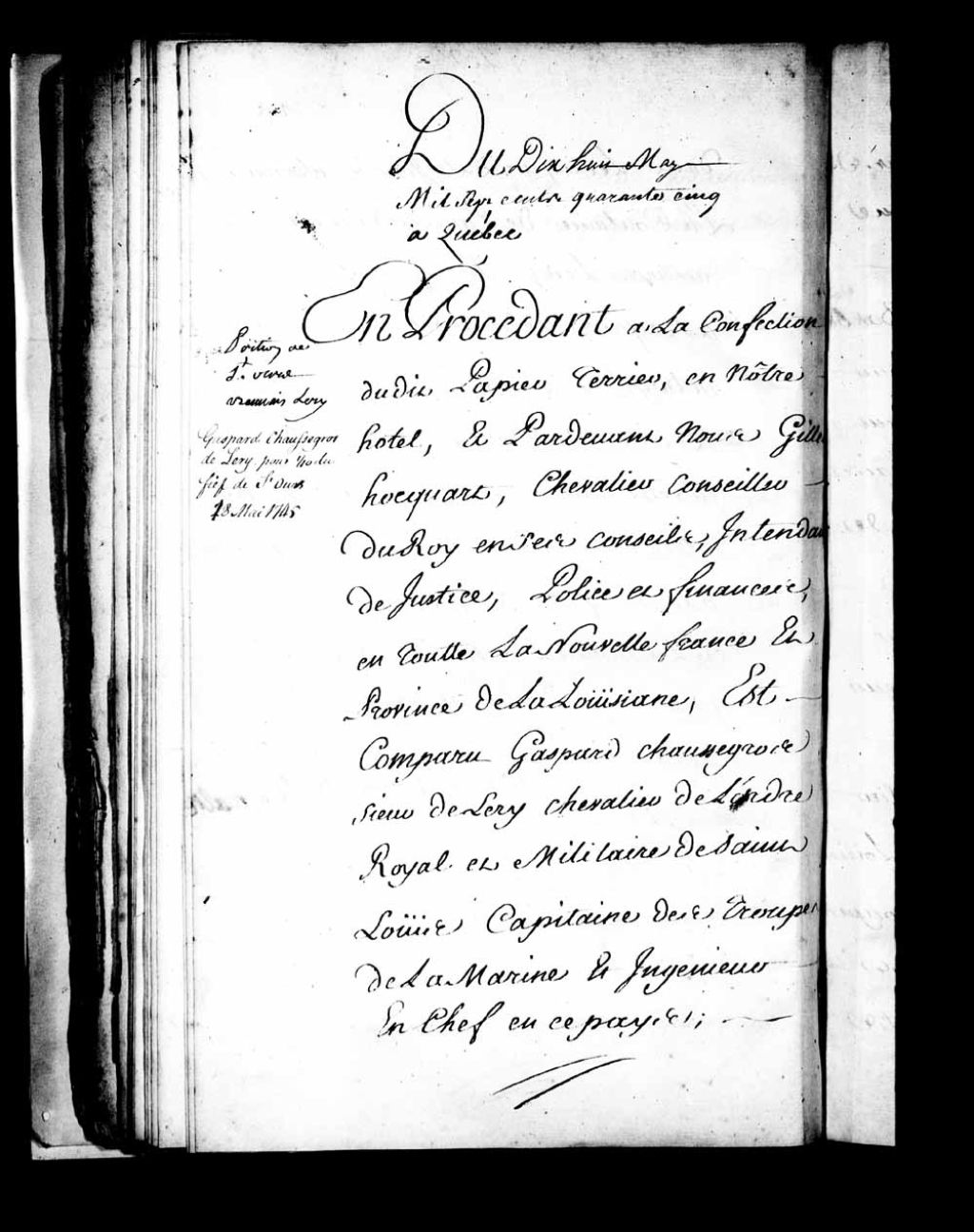 Acte de foi et hommage de Gaspard Chaussegros, sieur de Léry, Chevalier de l'Ordre militaire de Saint-Louis et ingénieur en chef de la Nouvelle-France, pour un dixième du fief et seigneurie de Saint-Ours, tant en son nom que comme tuteur des enfants mineurs issus de son mariage avec feue dame Marie-Renée Le Gardeur (LeGardeur) de Beauvais, 18 mai 1745, Archives nationales à Québec, Fonds Intendants, (03Q,E1,S4,SS2,P433).