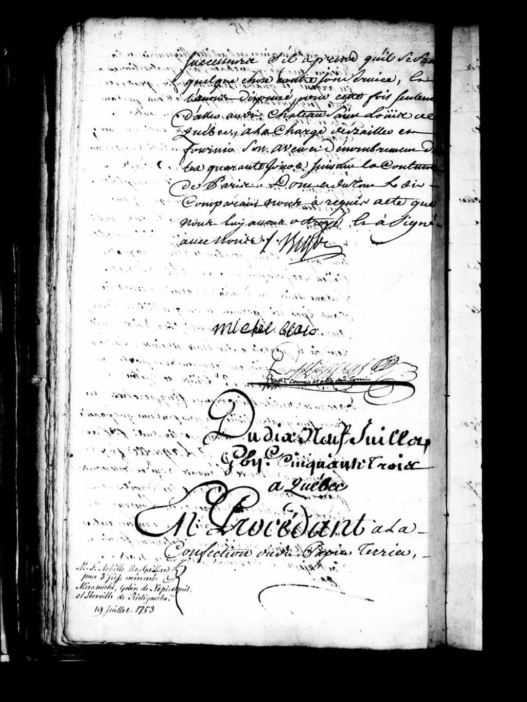 Acte de foi et hommage de damoiselle Marie-Françoise-Achille Rey Gaillard, tant comme héritière pour un tiers des feux Pierre Rey Gaillard, commissaire d'artillerie en Nouvelle-France, et Françoise Cailleteau, ses père et mère, héritière aussi pour la moitié de feue Jeanne-Françoise Rey Gaillard, sa soeur, laquelle était aussi héritière pour un pareil tiers de ses père et mère, entrée aussi en possession de l'hérédité de Pierre Rey Gaillard, son frère, absent depuis plus de trente ans de cette colonie, lequel était héritier pour un pareil tiers et pour pareille moitié de feue sa soeur, pour les fiefs de Miramichi, de Gobin Nepissiguit et Iberville de Ristigouche, 19 juillet 1753, Archives nationales à Québec, Fonds Intendants, (03Q,E1,S4,SS2,P444).