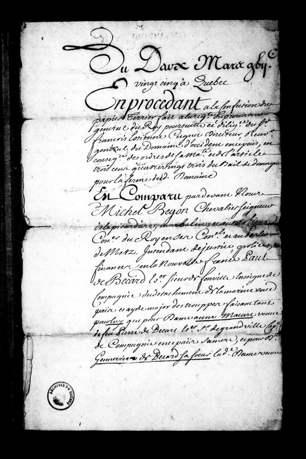 Acte de foi et hommage fait devant Michel Bégon, Chevalier, seigneur de la Picardière, Murbelin et autres lieux, conseiller du Roi, intendant en Nouvelle-France, par Paul Bécard de Fonville, enseigne d'une compagnie du détachement de la Marine en Nouvelle-France et aide-major des troupes, faisant tant pour lui que pour dame Anne Macart (Macard), sa mère, veuve de feu Pierre de Bécard, écuyer, sieur de Grandville (Granville), capitaine d'une compagnie en Nouvelle-France, et pour damoiselle Geneviève de Bécard, sa soeur, ladite dame veuve de Grandville étant propriétaire de la moitié des îles suivantes, soit la petite île aux Oies, l'île aux Grues, l'île au Canot, l'île Patience et l'île vulgairement nommée la Grosse Île, à cause de la communauté de biens qui a été entre elle et ledit feu sieur de Grandville, et ledit comparant avec sa soeur étant propriétaire pour chacun une moitié dans l'autre moitié desdites îles tant comme héritiers du feu sieur de Grandville que comme ayant acquis les droits de Pierre de Bécard de Grandville, leur frère, fils aîné du feu sieur de Grandville