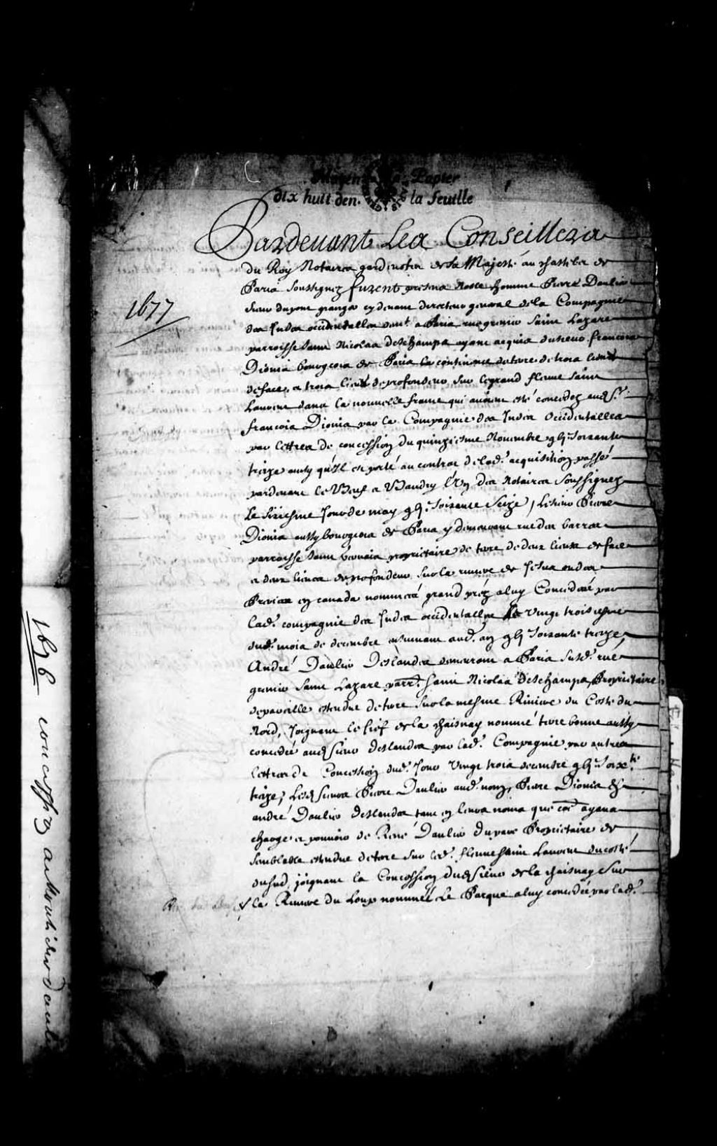 Procuration donnée par Pierre Daulier, sieur Dupont Granger, ci-devant directeur général de la Compagnie des Indes occidentales, demeurant rue Saint-Lazare à Paris, comme ayant acquis de François Dionis la continence de terre de trois lieues de face et de trois lieues de profondeur (fief de Verbois) qui lui avait été concédée le 15 novembre 1673; aussi par Pierre Dionis, bourgeois demeurant rue des Barras à Paris, propriétaire d'une terre de deux lieues de face sur la rivière de Jésus ou des Prairies en Canada, laquelle terre étant nommée Grandpré et ayant été concédée le 23 décembre 1673; et par André Daulier Deslandes, demeurant rue Grenier Saint-Lazare dans la paroisse Saint-Nicolas Deschamps de Paris, propriétaire de pareille étendue de terre sur la même rivière du côté du nord, joignant le fief de Lachenaie, laquelle étendue étant nommée Terrebonne et ayant été concédée le 23 décembre 1673, lesdits Daulier, Dionis et Daulier Deslandes agissant en leur nom et en celui de René Daulier Duparc, propriétaire de semblable étendue de terre sur le fleuve Saint-Laurent, du côté du sud, joignant la concession du sieur de Lachenaye sur la rivière du Loup, laquelle étendue étant nommée Le Parque (Leparc) et lui ayant été concédée le 23 décembre 1673, ladite procuration donnant pouvoir au procureur de prendre possession réelle des terres à eux concédées, de rendre foi et hommage, de payer les droits et devoirs, d'en faire exécuter l'arpentage, d'y planter des bornes et d'y faire les défrichements nécessaires (Notaire Baudry, garde-notes de Sa Majesté, demeurant en France)