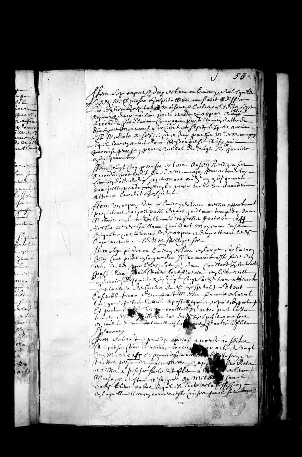 - Transcription du texte avec orthographe modernisée : «Du vingt-sixième jour de novembre 1667, les assises tenant, de relevée, le procureur fiscal présent. Est comparu par-devant nous Martin Boutet, Sieur de Saint-Martin, procureur des Pères de la Compagnie de Jésus du Collège de Québec et missions en la Nouvelle-France, lequel au dit nom avoue et déclare tenir en la censive des dits seigneurs toutes les terres comprises entre celles des religieuses Ursulines, le coteau Sainte-Geneviève, les religieuses hospitalières en parti et partie les terres de Repentigny les dites terres sises au lieu dit la commune appartenantes aux dits pères par contrat d'échange passé devant Rageot, notaire, le vingtième août dernier qu'ils en auraient fait avec les dites religieuses hospitalières contre autres terres sises au même lieu et proche icelui sans aucun retour, le dit espace de terre susdéclaré ayant appartenu aux dites religieuses hospitalières par [...]