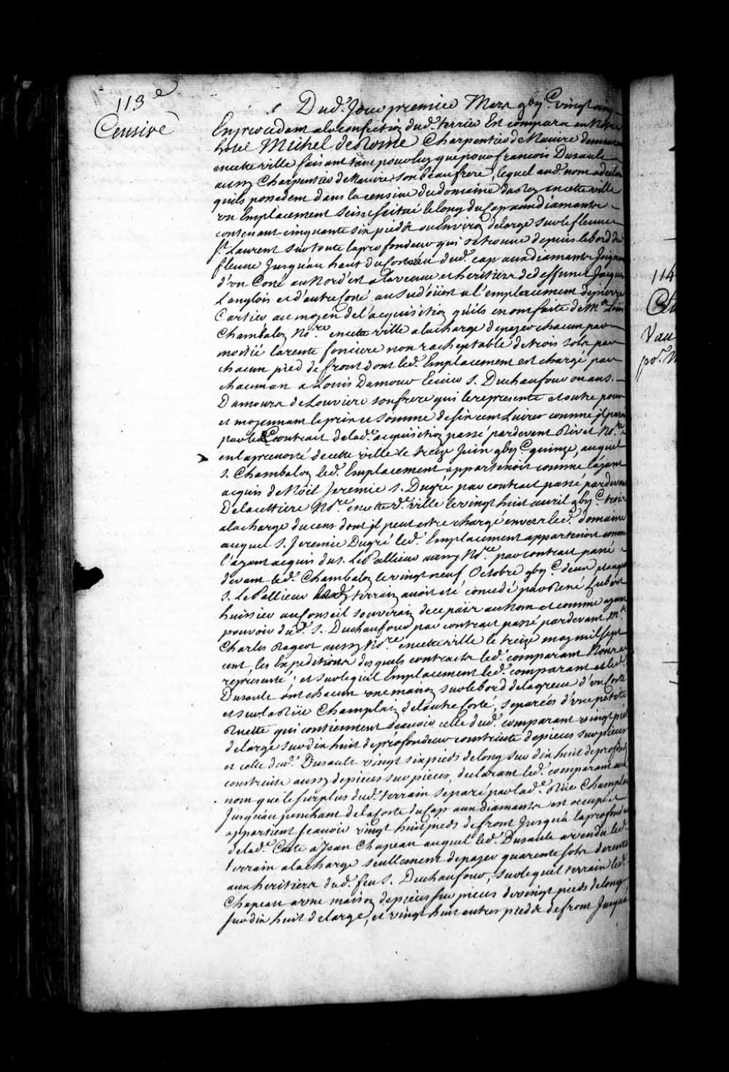 Déclaration de Michel Derome, charpentier de navire de Québec, faisant tant pour lui que pour François Dussault, charpentier de navire de Québec, son beau-frère, quant à un emplacement qu'il déclare tenir dans la censive du Domaine du Roi, lequel emplacement étant situé le long du Cap-aux-Diamants à Québec, 1er mars 1725, Archives nationales à Québec, Fonds Intendants, (03Q,E1,S4,SS3,P113).