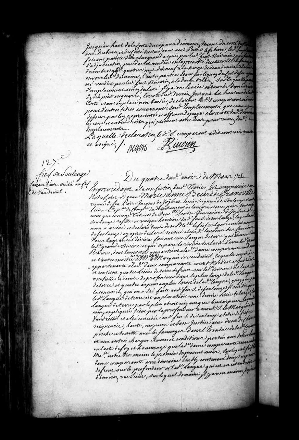 Aveu et dénombrement de Marie-Anne Bécard de Grandville (Bécart de Granville), veuve de feu Pierre-Jacques de Joybert, écuyer, seigneur de Soulanges, pour le fief vulgairement nommé de Soulanges, 4 mars 1725, Archives nationales à Québec, Fonds Intendants, (03Q,E1,S4,SS3,P127).