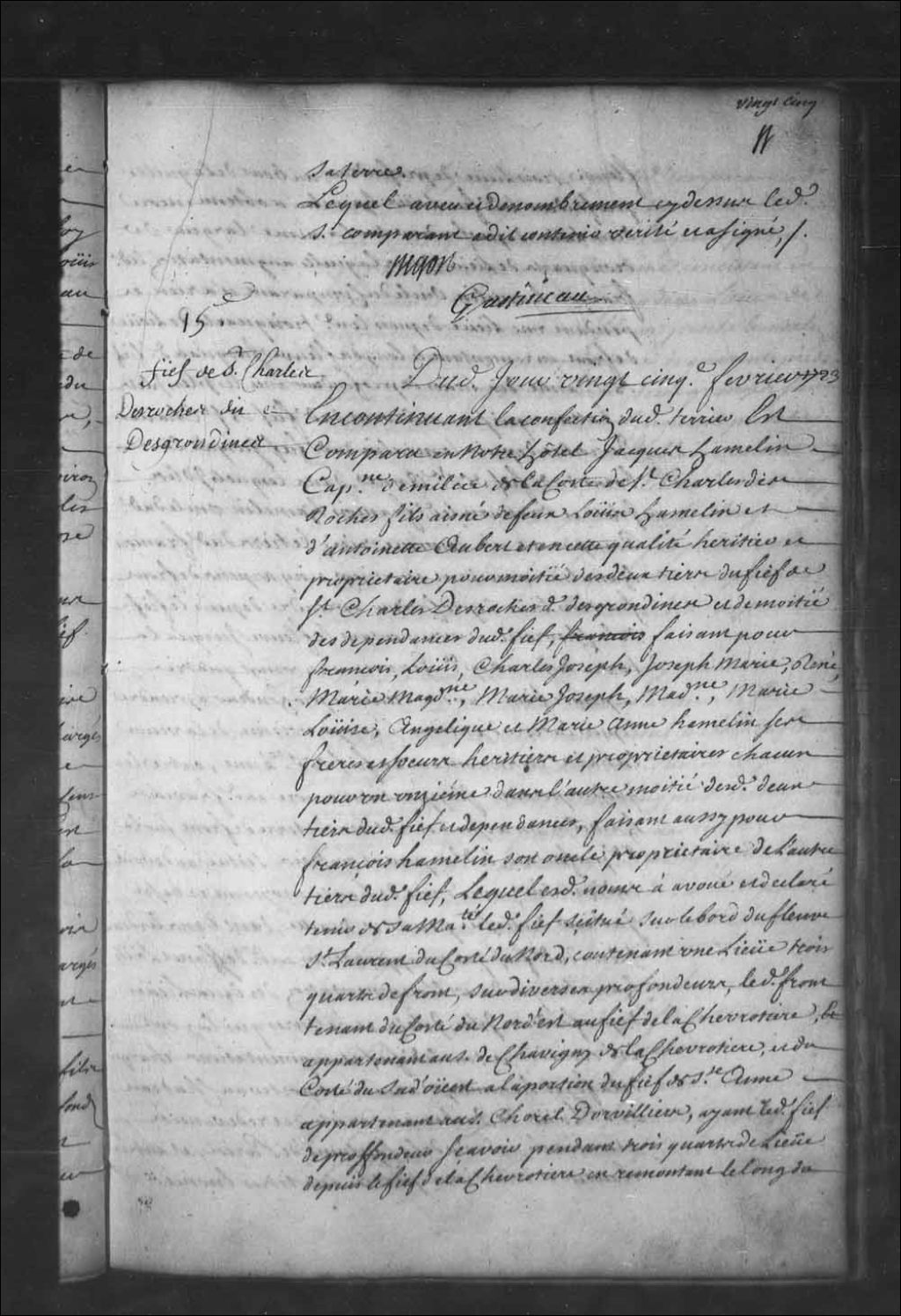 - Aveu et dénombrement de Jacques Hamelin, capitaine de milice, fils aîné de feu Louis Hamelin et d'Antoinette Aubert, leur héritier et propriétaire pour la moitié des deux tiers du fief de Saint-Charles-des-Roches dit Desgrondines (des Grondines) et de la moitié des dépendances dudit fief, faisant pour ses frères et soeurs héritiers et propriétaires chacun pour un onzième dans l'autre moitié des deux tiers dudit fief, lequel aveu et dénombrement étant fait pour ledit fief de Saint-Charles-des-Roches dit Desgrondines (des Grondines)