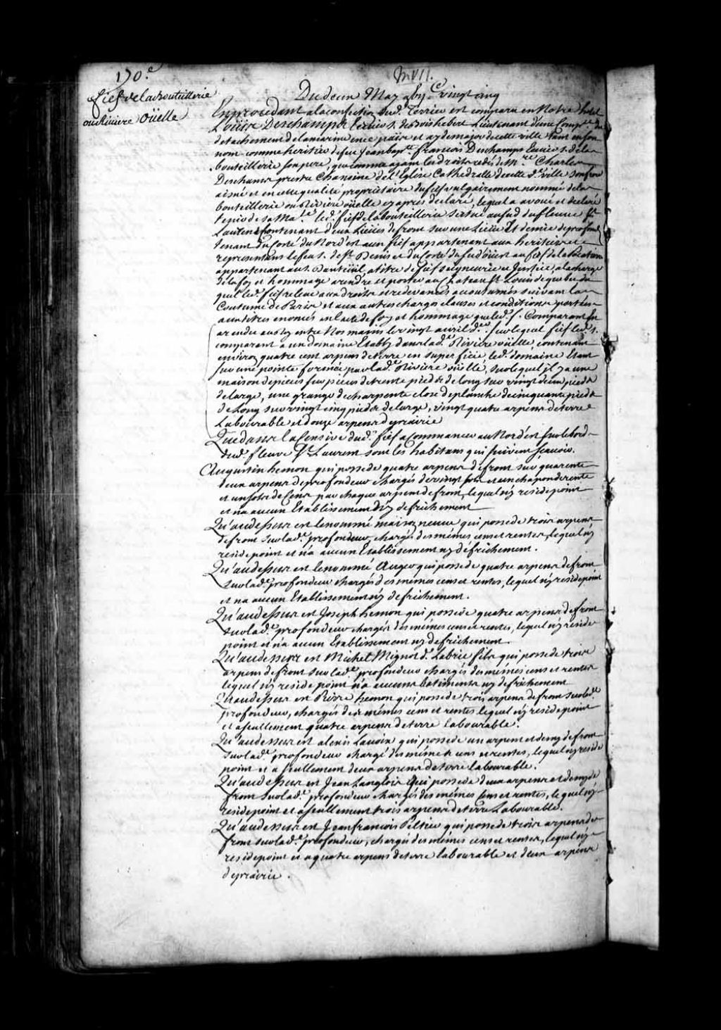 Aveu et dénombrement de Louis Deschamps, écuyer, sieur de Boishébert, lieutenant d'une compagnie du détachement de la Marine en Nouvelle-France et aide-major, tant en son nom comme héritier du feu Jean-Baptiste François Deschamps, de son vivant écuyer et sieur de la Bouteillerie, son père, que comme ayant les droits cédés de maître Charles Deschamps, prêtre chanoine de l'église cathédrale, son frère aîné, pour le fief vulgairement nommé de la Bouteillerie ou Rivière-Ouelle