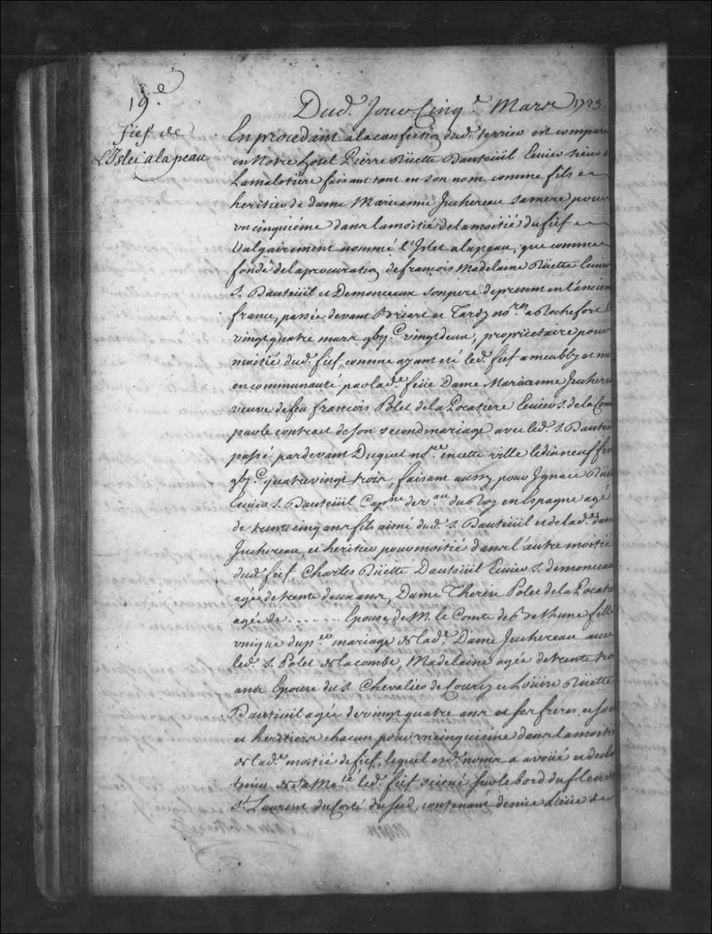 Aveu et dénombrement de Pierre Ruette d'Auteuil, sieur de la Malottière (La Malotière), faisant tant en son nom que comme fils et héritier de dame Marie-Anne Juchereau, sa mère, pour un cinquième dans la moitié de la moitié du fief vulgairement nommé l'Ilet-à-la-Peau, lequel aveu et dénombrement étant fait pour ledit fief de L'Islet à la Peau, 5 mars 1723, Archives nationales à Québec, Fonds Intendants, (03Q,E1,S4,SS3,P19).