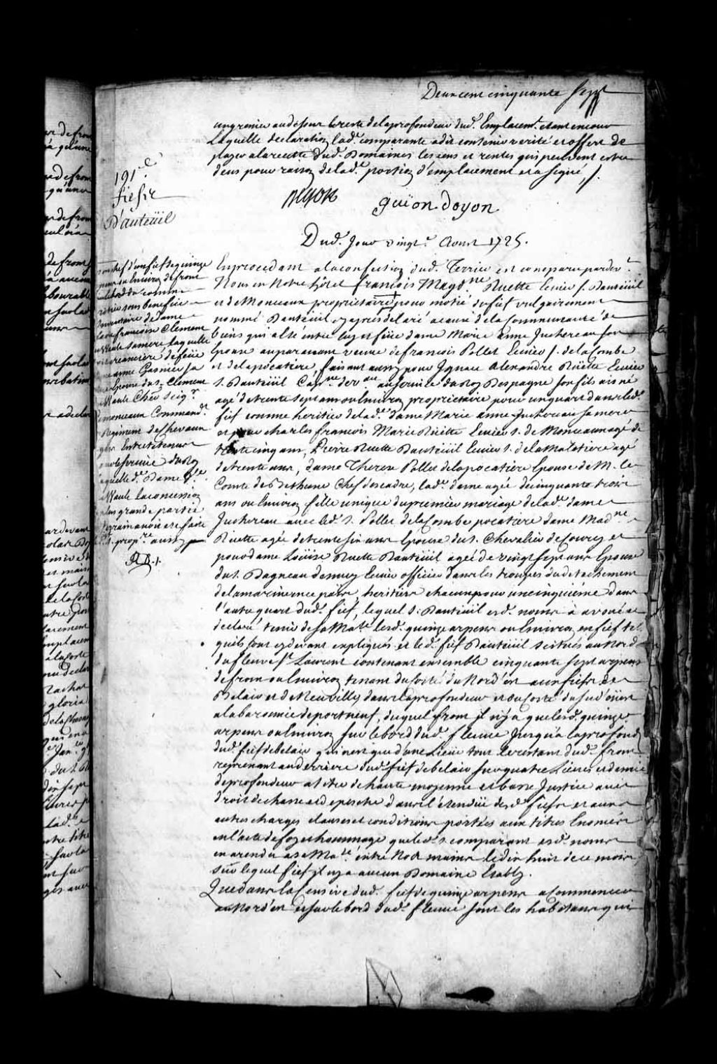 Aveu et dénombrement de François-Madeleine Ruette, écuyer, sieur d'Auteuil et de Monceaux, pour la moitié du fief d'Auteuil, 20 août 1725, Archives nationales à Québec, Fonds Intendants, (03Q,E1,S4,SS3,P191).