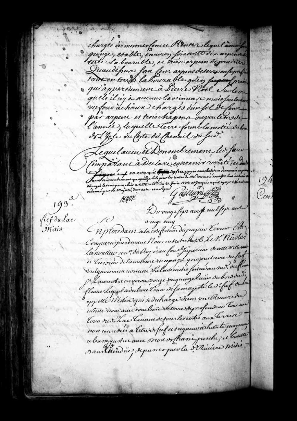 Aveu et dénombrement du sieur Nicolas Lanoullier (Lanouiller), conseiller du Roi au Conseil supérieur et trésorier de la Marine en Nouvelle-France, pour le fief vulgairement nommé le Lac-Mitis (Métis), 27 août 1725, Archives nationales à Québec, Fonds Intendants, (03Q,E1,S4,SS3,P193).