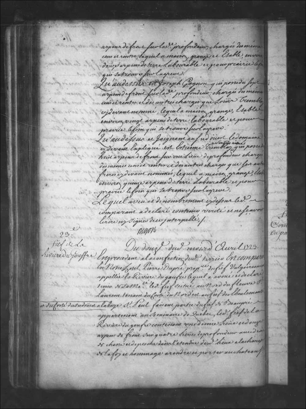 Aveu et dénombrement de Pierre Dupré pour le fief vulgairement appelé la Rivière du Gouffre, 12 avril 1723, Archives nationales à Québec, Fonds Intendants, (03Q,E1,S4,SS3,P23).
