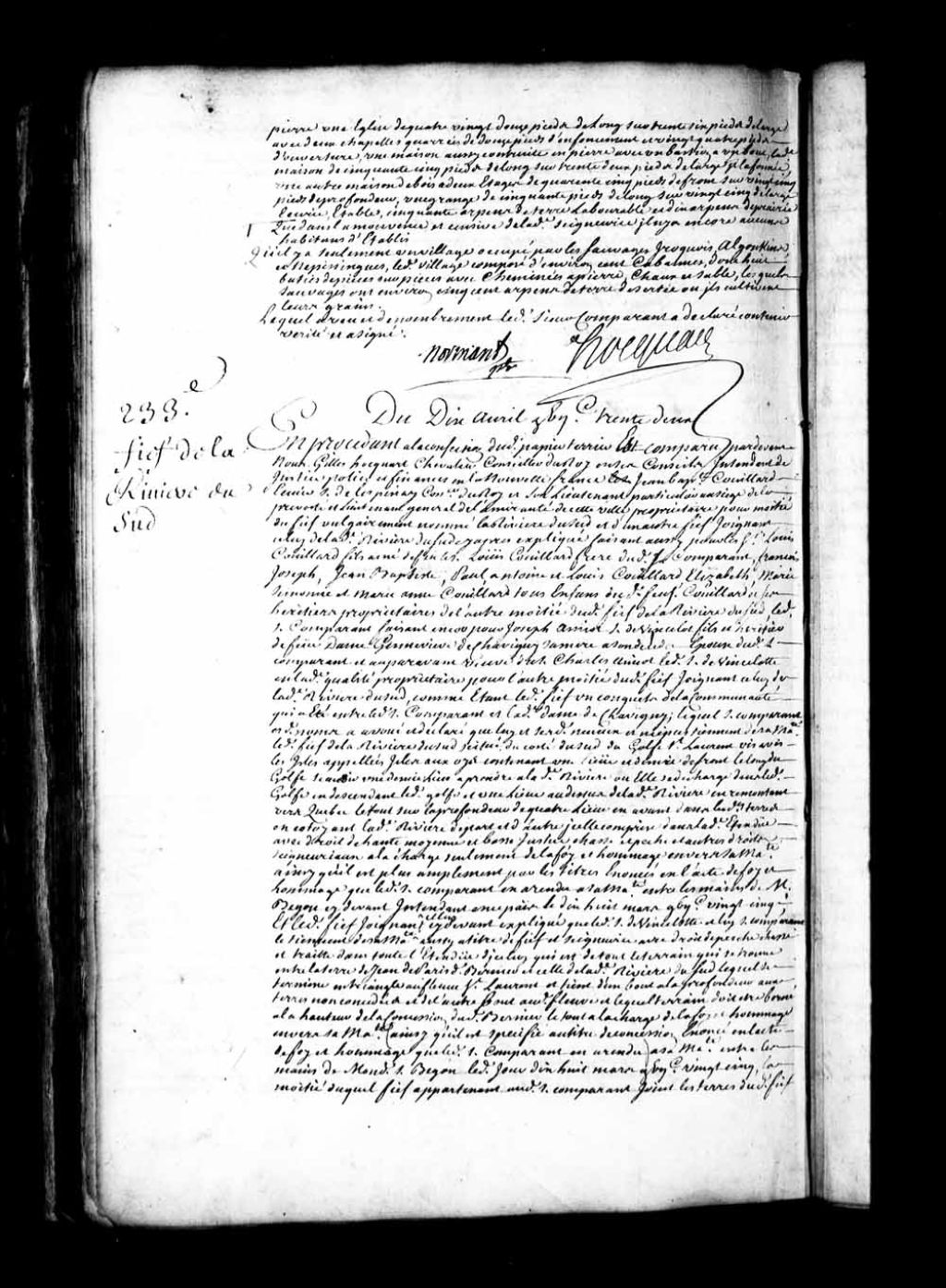 Aveu et dénombrement de Jean-Baptiste Couillard, écuyer, sieur de Lespinay (L'Espinay), conseiller du Roi, Son lieutenant particulier au siège de la Prévôté de Québec et lieutenant général de l'Amirauté, pour le fief et seigneurie de la Rivière-du-Sud