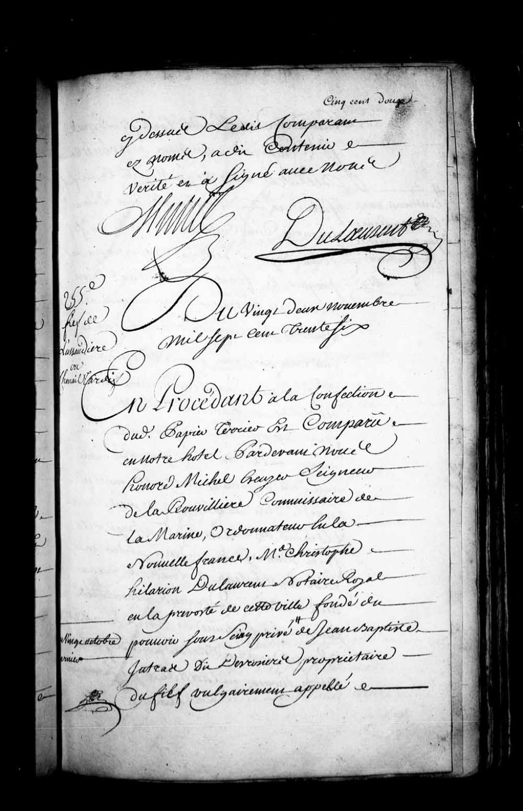 Aveu et dénombrement de Christophe-Hilarion Dulaurent (Du Laurent), notaire royal en la Prévôté de Québec, fondé de procuration de Jean-Baptiste Jutras dit Desrosiers, pour le fief et seigneurie de Lussaudière (Lussodière, Lussière) ou Chenail-Tardif