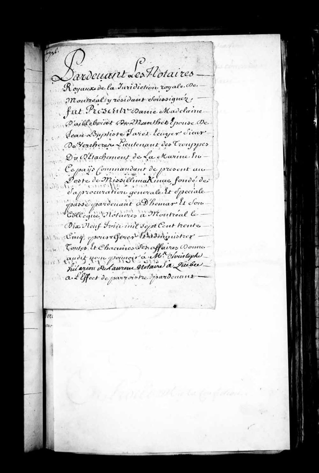 - Aveu et dénombrement de Christophe-Hilarion Dulaurent (Du Laurent), au nom et comme fondé de procuration de dame Madeleine d'Ailleboust de Manthet, épouse de Jean-Baptiste Jarret de Verchères, lieutenant dans les troupes du détachement de la Marine, commandant au poste de Michillimakinac, propriétaire de la moitié du fief de Verchères, tant en son nom comme fils aîné et héritier de François Jarret de Verchères, que faisant pour Louis Jarret de Verchères, pour Joseph Jarret de Pouligny, pour Marie-Madeleine Jarret de Verchères, épouse de Pierre-Thomas Tarieu de La Pérade (LaPérade), pour les enfants de feue Angélique Jarret de Verchères, veuve de Nicolas-Antoine Coulon de Villiers, et pour Marguerite Jarret de Verchères, épouse de Léon Levreau de Langy (Levrault de Langis), lequel aveu et dénombrement étant fait pour ledit fief de Verchères